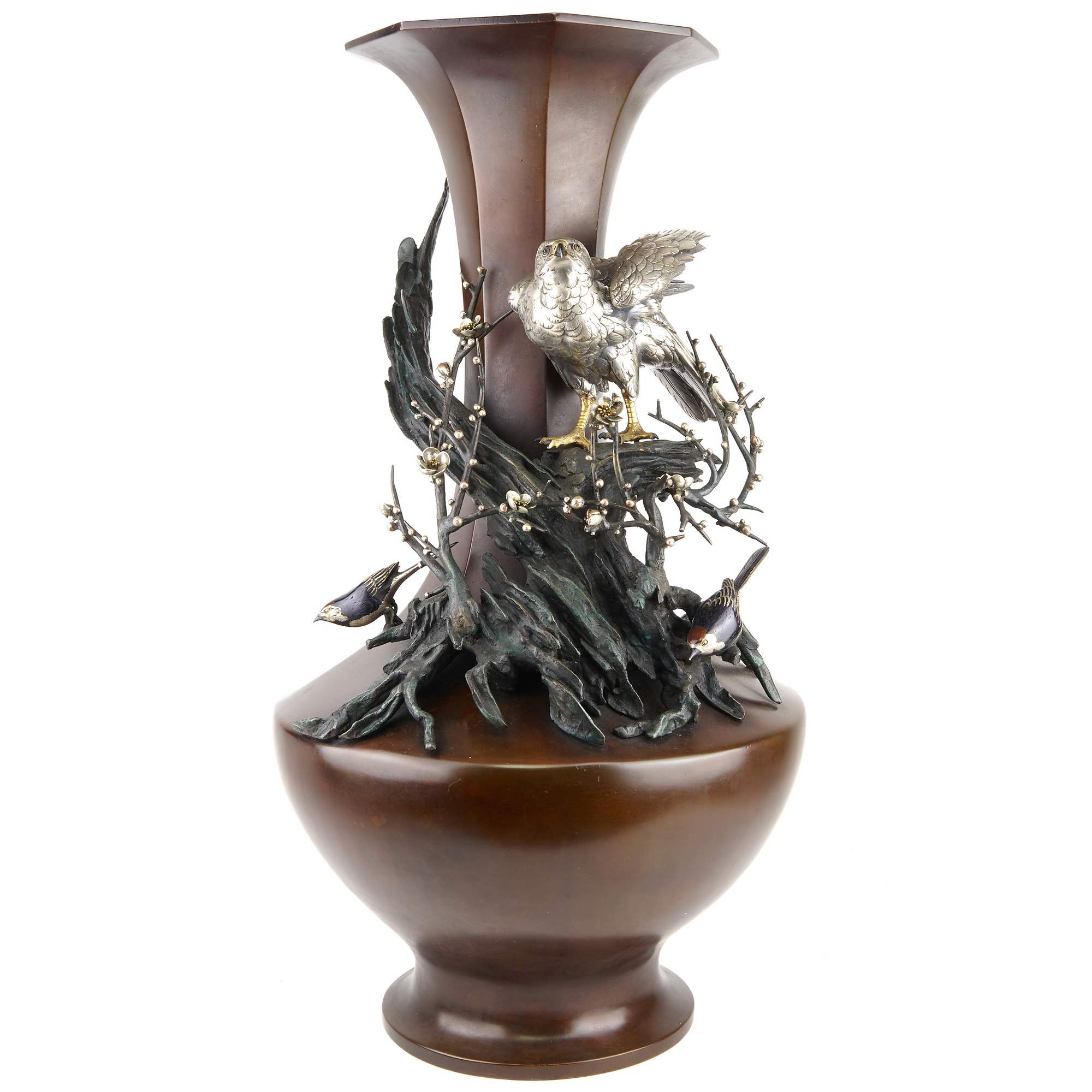 Очень красивая интерьерная вещь, большая старинная ваза со сценой охотящегося ястреба. Ваза изготовлена в Японии в период Мейдзи ( 1868-1912 гг. ). Поражает качество обработки ( литье, патинирование, серебрение ) , изящность форм и лаконичность изделия. Ваза смотрится легко и изящно. Она хорошо будет смотреться в любом интерьере. Отличная сохранность.