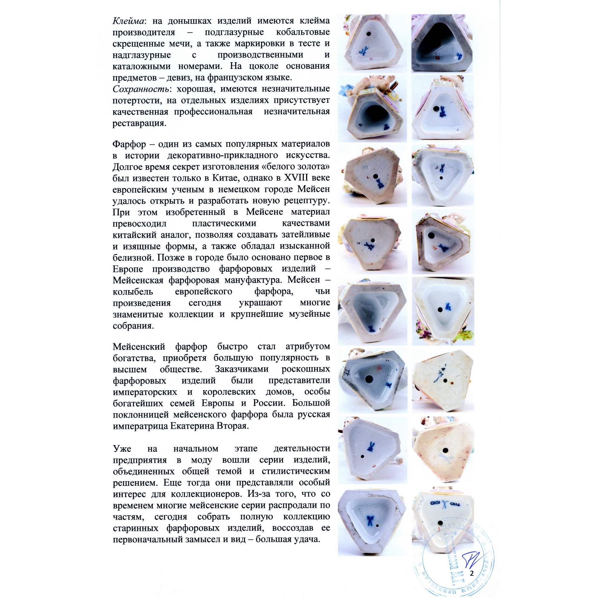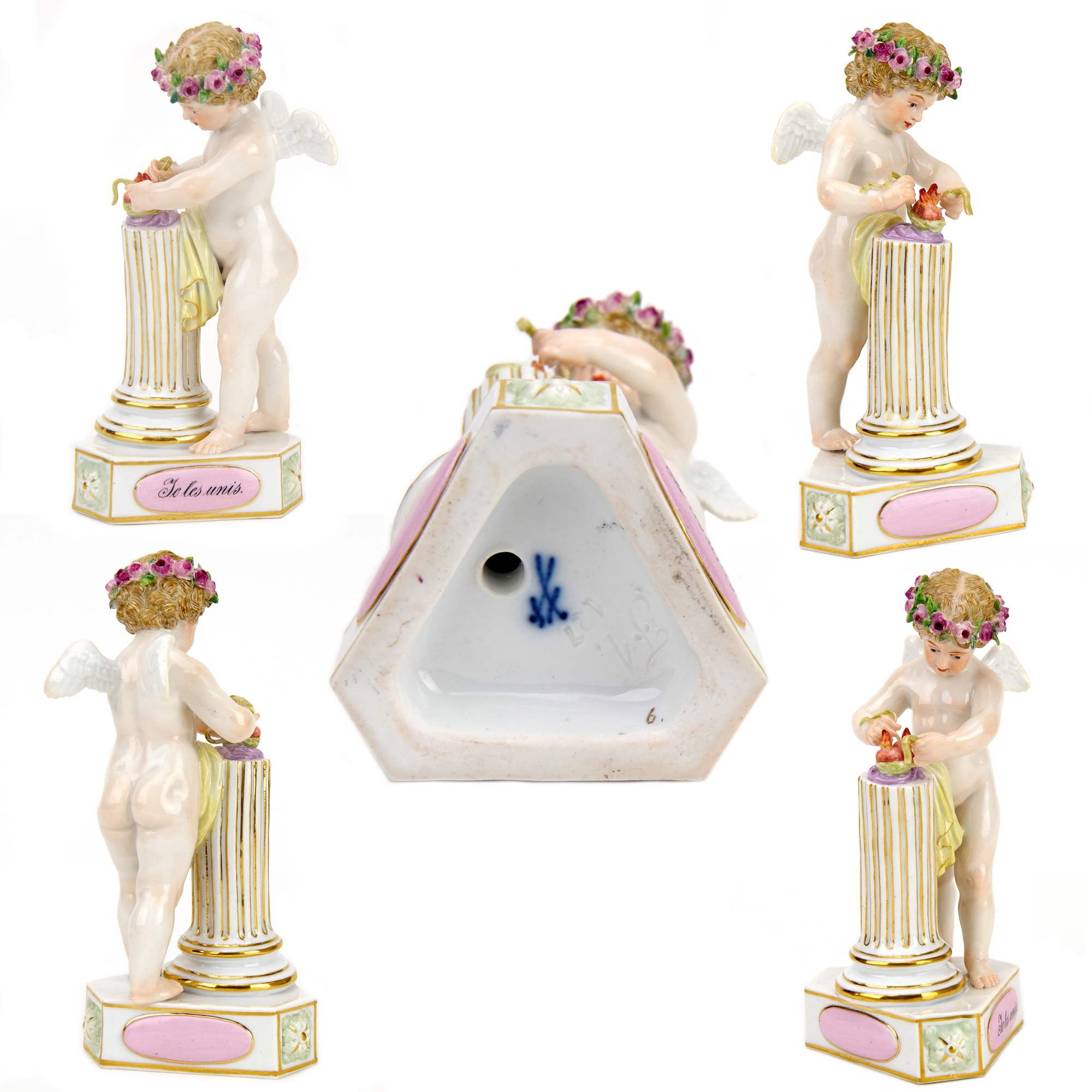Одна из самых известных и популярных серий мейсенской мануфактуры, посвященная вечной теме любви, «Амуры с девизами» в полной комплектации – 16 статуэток. Серия создана по моделям ведущего скульптора и художника знаменитого фарфорового предприятия Виктора Мишеля Асье (1736-1799). Мейсенская фарфоровая мануфактура – это колыбель европейского фарфора, до сих пор являющаяся ведущим фарфоровым производством в Европе. Изделия мануфактуры долгие годы, века оставались лучшими и востребованными, а в наши дни – представляют особый интерес для коллекционирования. Каждая из фигурок амуров имеет свой сюжет, на ее постаменте расположен соответствующий сюжету девиз любви, написанный на французском, например: «Я их объединяю», «Я открываю сердца», «Я его пленю». Эти высказывания отражают разные возможные варианты развития нежного чувства, тем самым собирая воедино и увековечивая самое удивительное, непредсказуемое и прекрасное чувство – любовь.