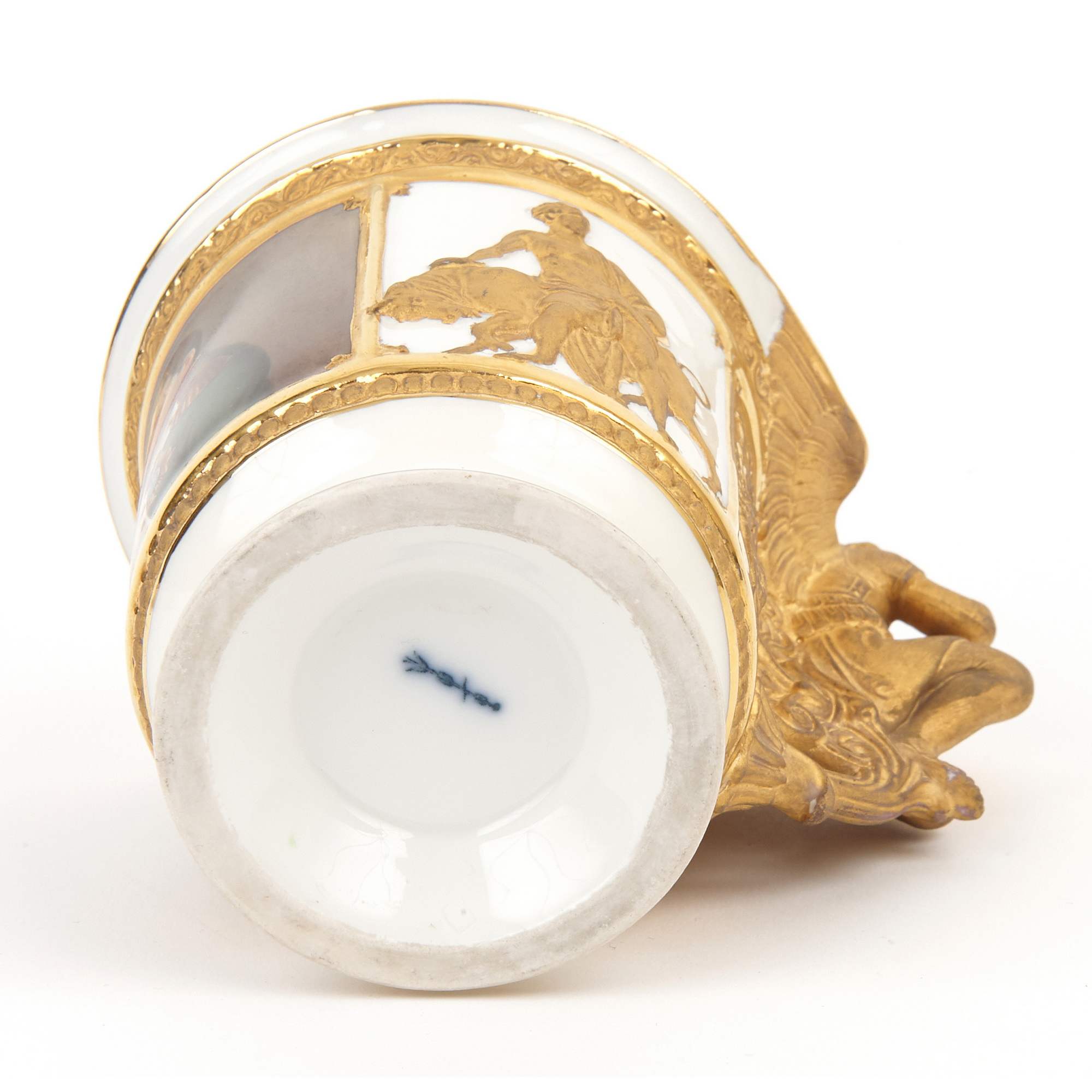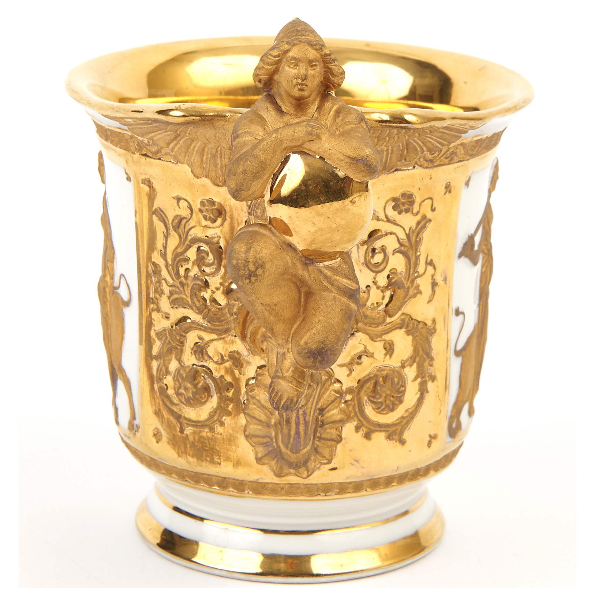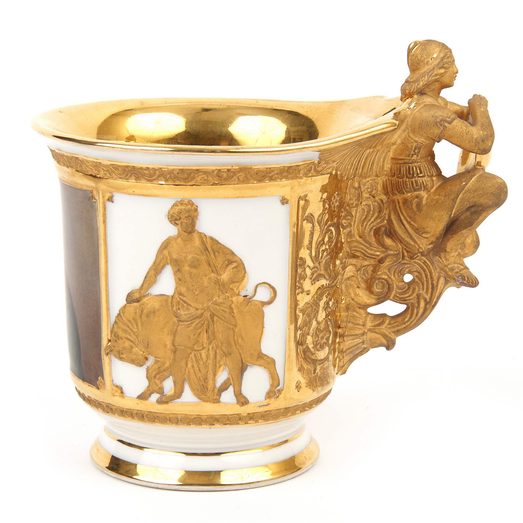 Красивая большая, старинная чайная пара в стиле ампир с портретом Наполеона Бонапарта в мундире. Прекрасный образец продукции известной берлинской фарфоровой мануфактуры КПМ ( Королевская Прусская Мануфактура ). Основана в 1751 году в Берлине Вильгельмом Каспаром Вегели. Реорганизована в 1763 году королём Пруссии Фридрихом II Великим. Он дал компании название «Королевская фарфоровая мануфактура в Берлине» и разрешил использовать в качестве символа королевский скипетр основателя независимой Пруссии, курфюрста Бранденбургского. Продукцию фабрики всегда отличал высочайший уровень художественного и технического исполнения. Антиквариат. Очень хорошая сохранность.