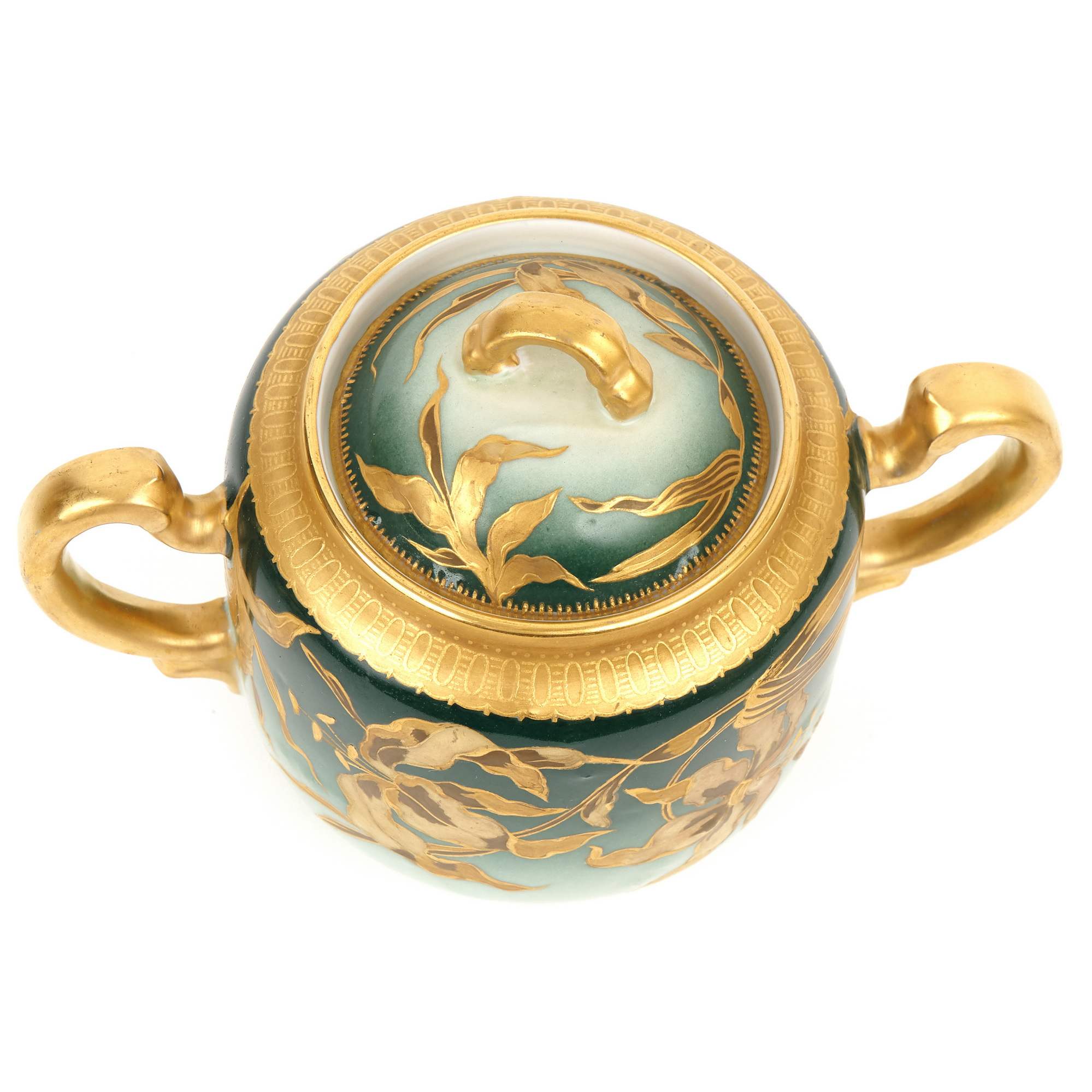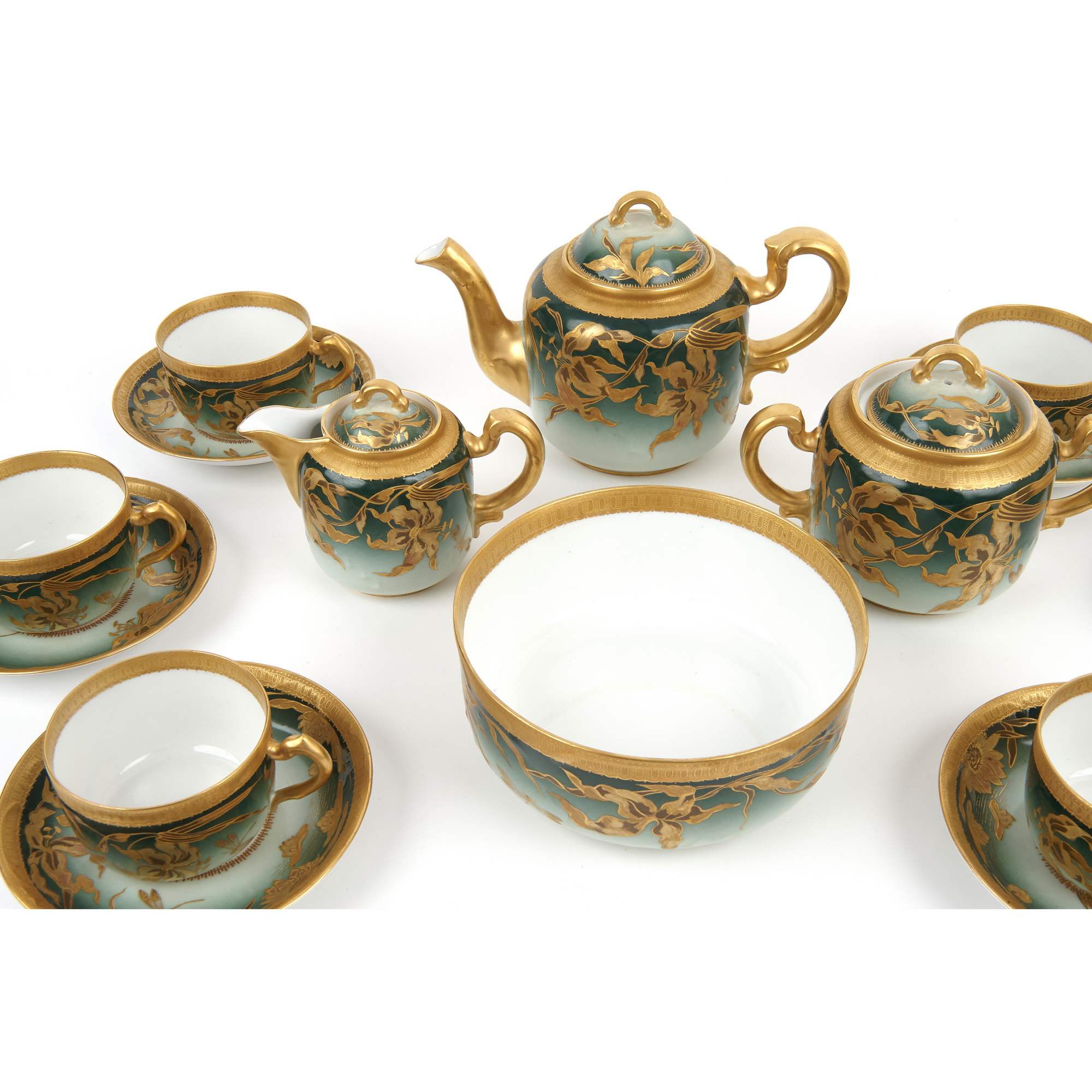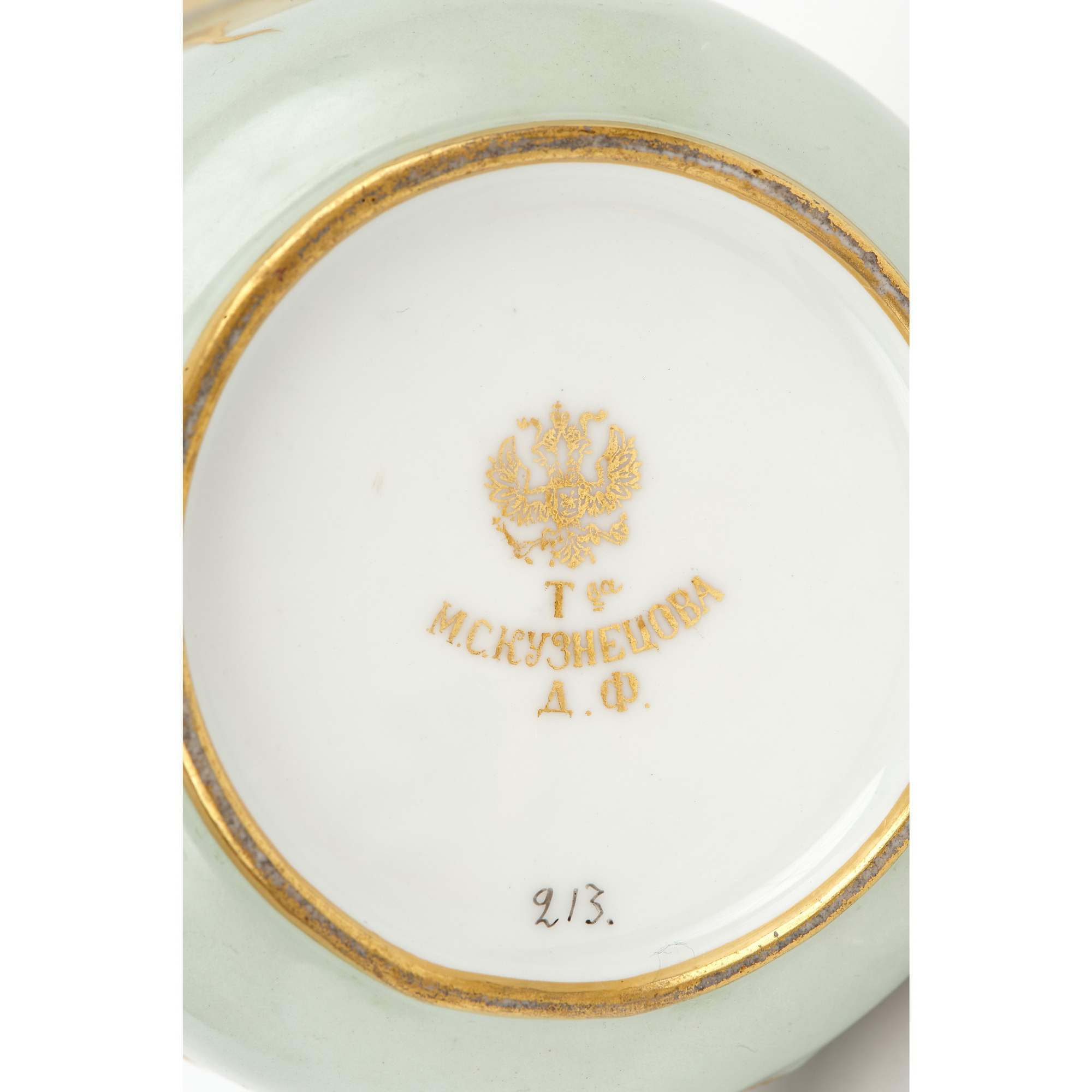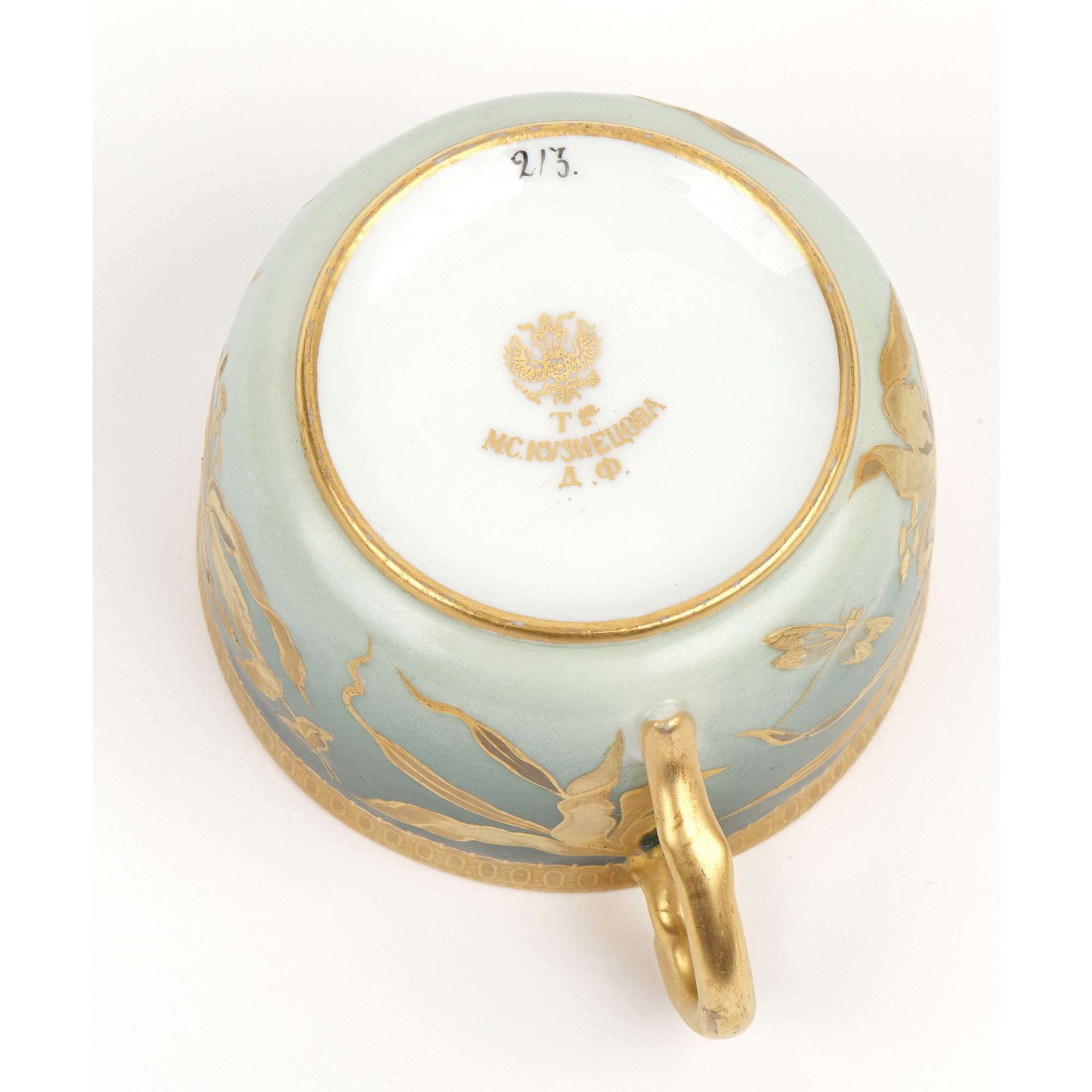 Красивый, яркий старинный сервиз изготовлен мастерами фабрики Кузнецова в стиле модерн. Превосходный белый тонкий фарфор покрыт изумительной росписью золотом разных оттенков. Относится к разряду штучных, заказных изделий, об этом, в том числе, говорит марка фабрики исполненная золотом.