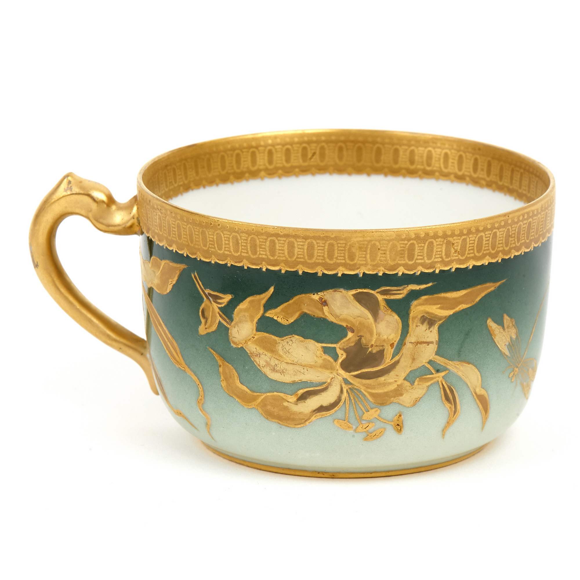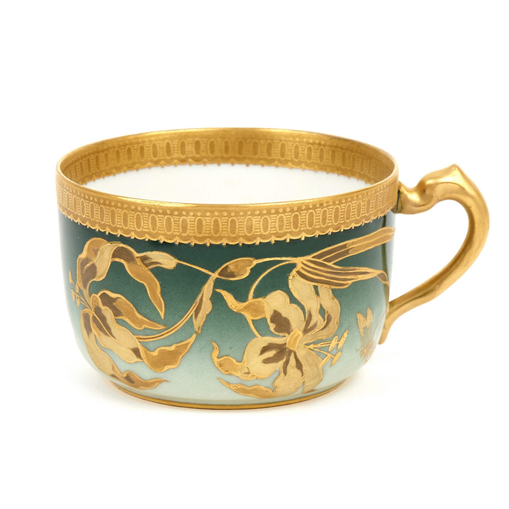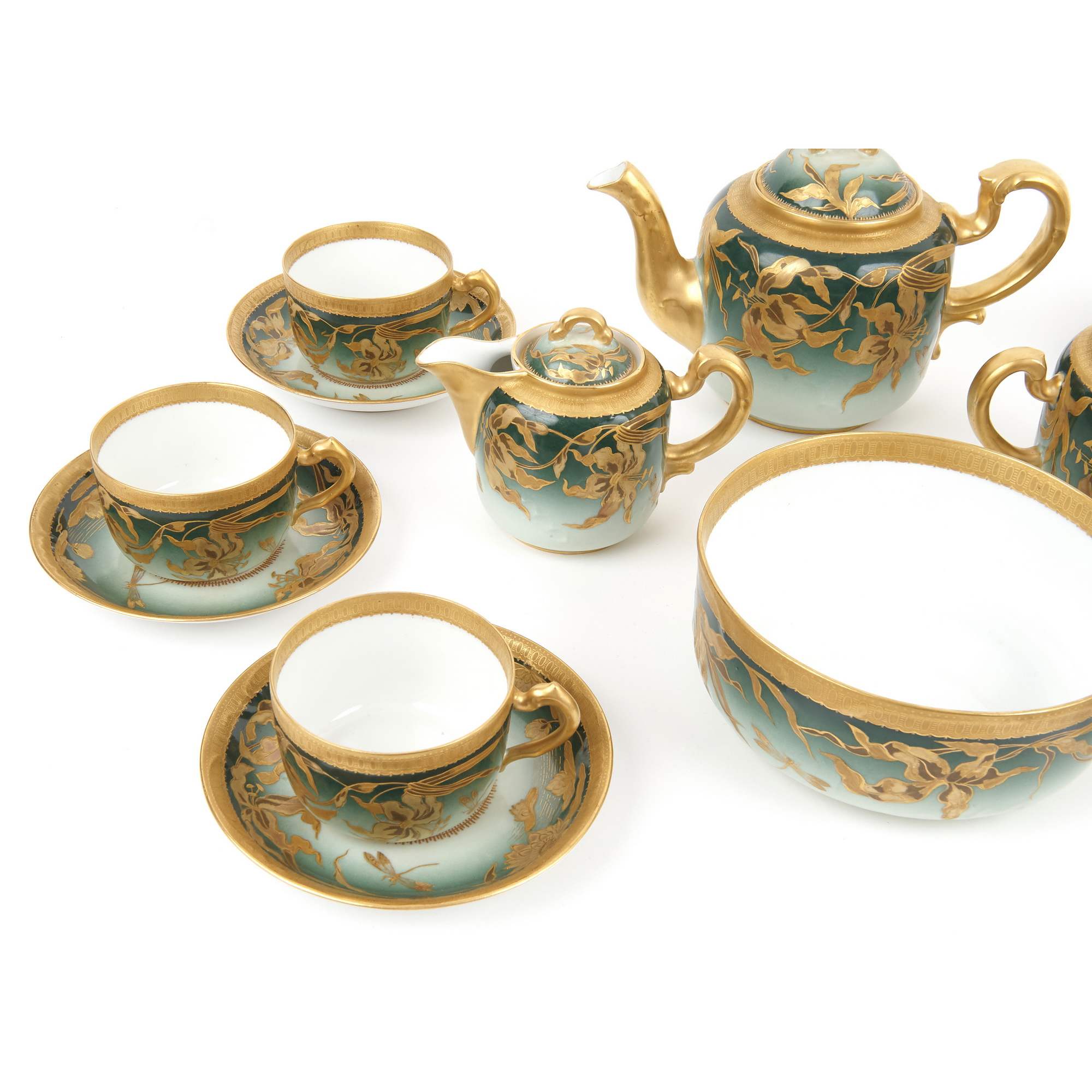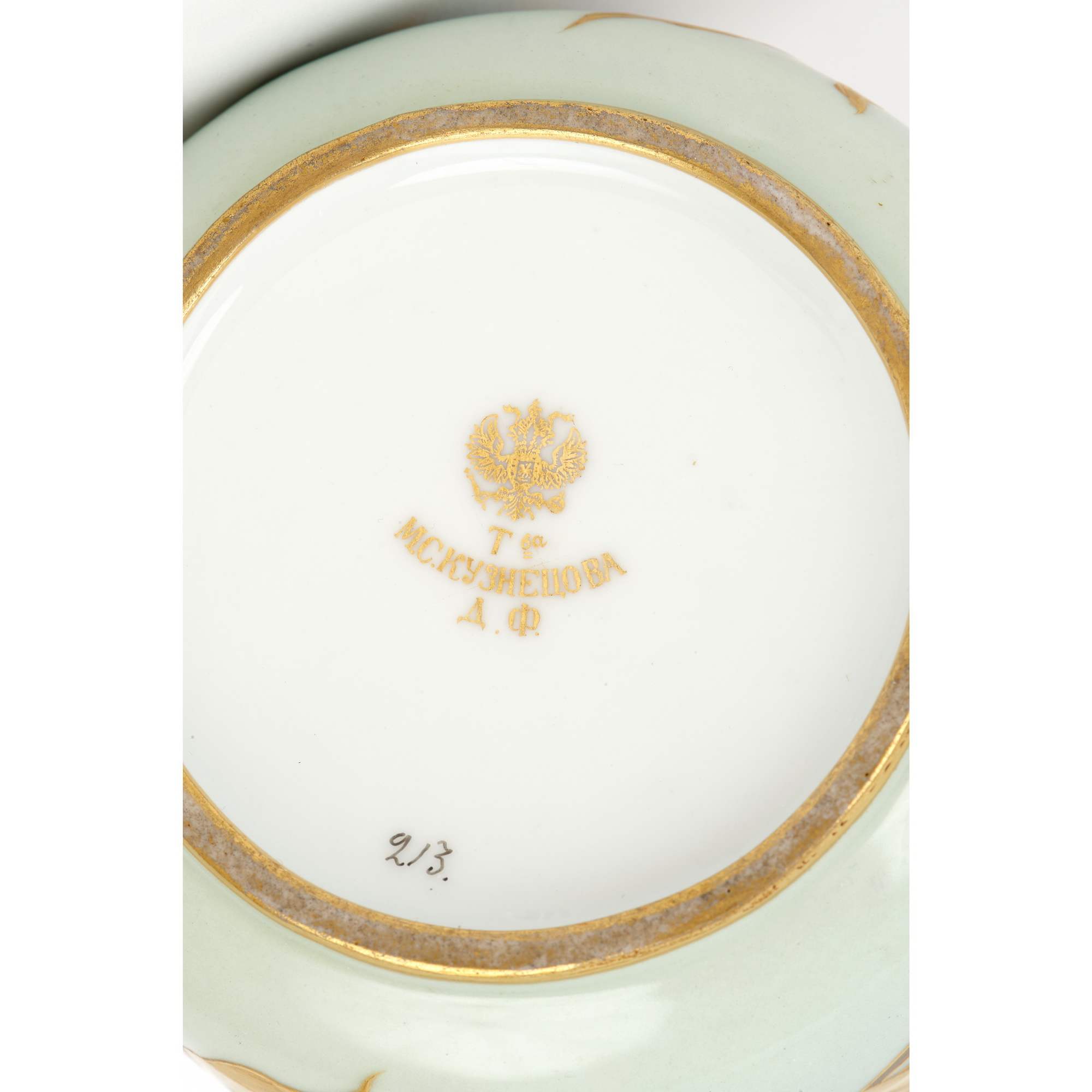 Красивый, яркий старинный сервиз изготовлен мастерами фабрики Кузнецова в стиле модерн. Превосходный белый тонкий фарфор покрыт изумительной росписью золотом разных оттенков. Относится к разряду штучных, заказных изделий, об этом, в том числе, говорит марка фабрики исполненная золотом.