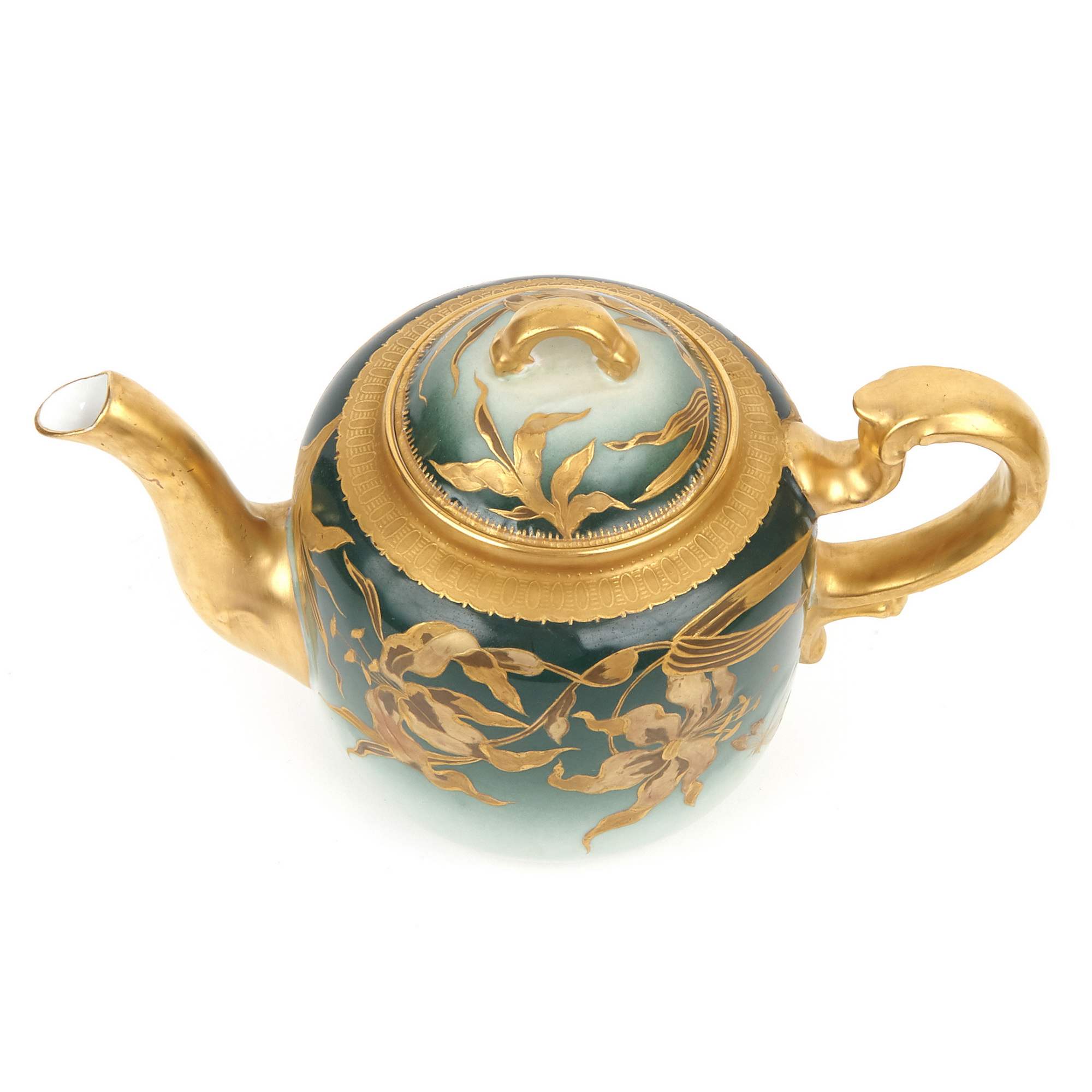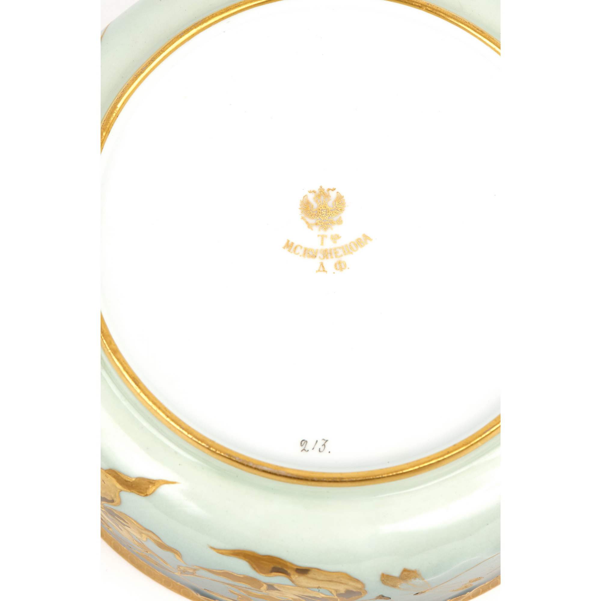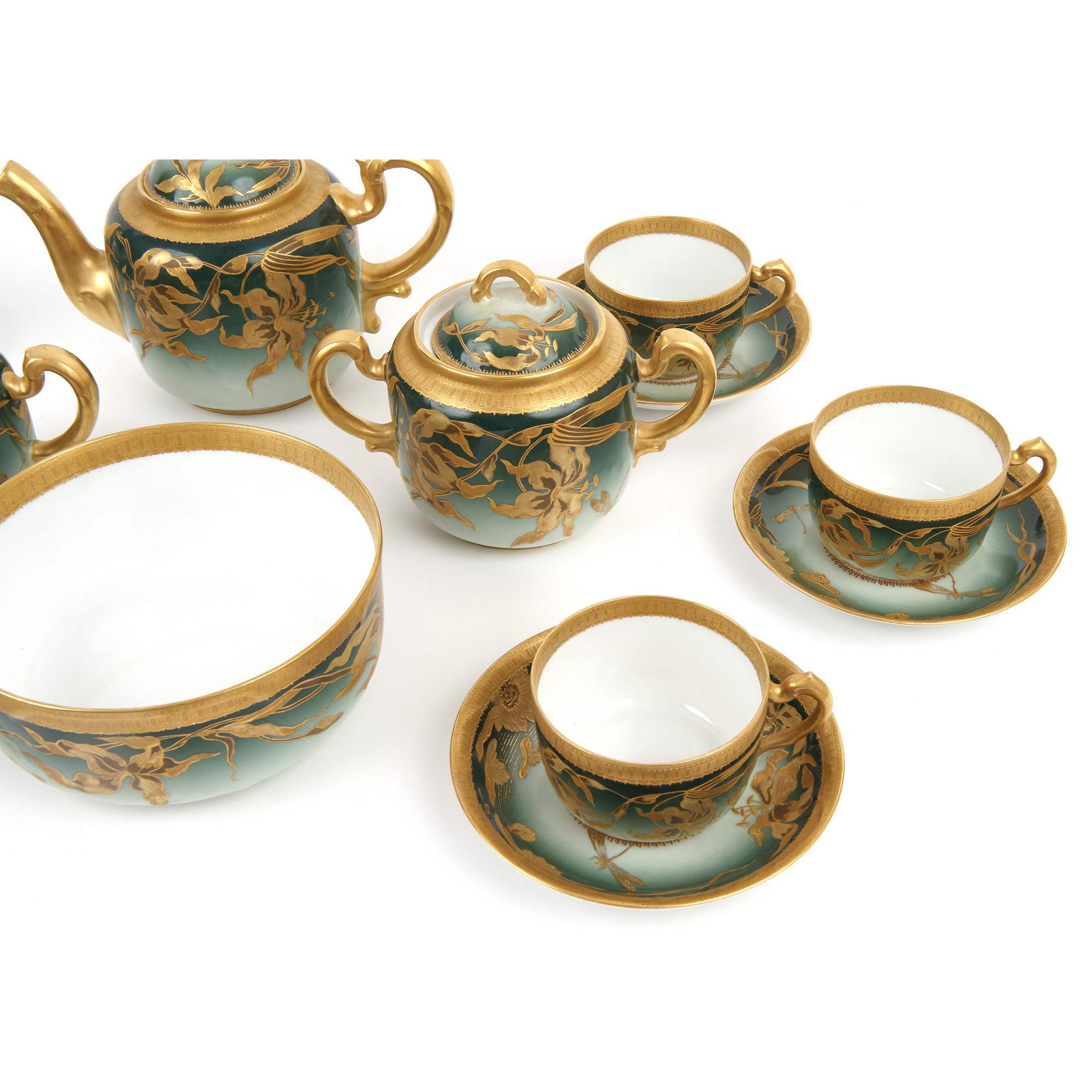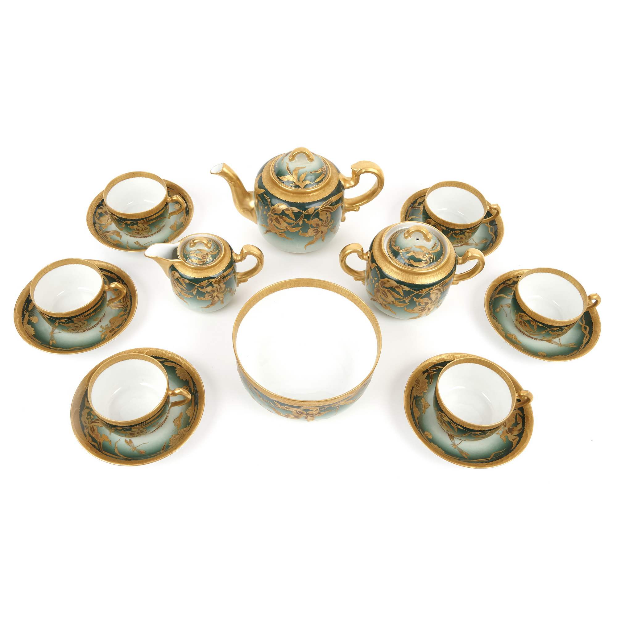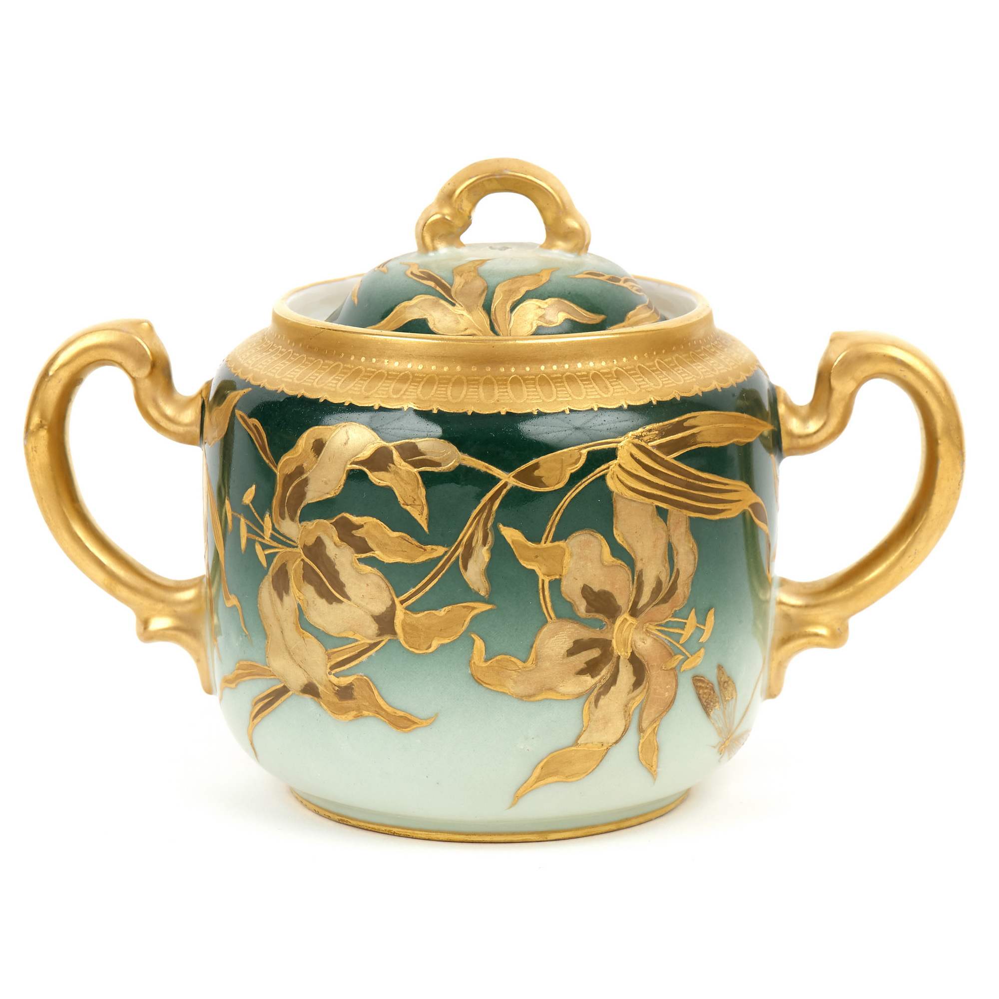 Красивый, яркий старинный сервиз изготовлен мастерами фабрики Кузнецова в стиле модерн. Превосходный белый тонкий фарфор покрыт изумительной росписью золотом разных оттенков. Относится к разряду штучных, заказных изделий, об этом, в том числе, говорит марка фабрики исполненная золотом.