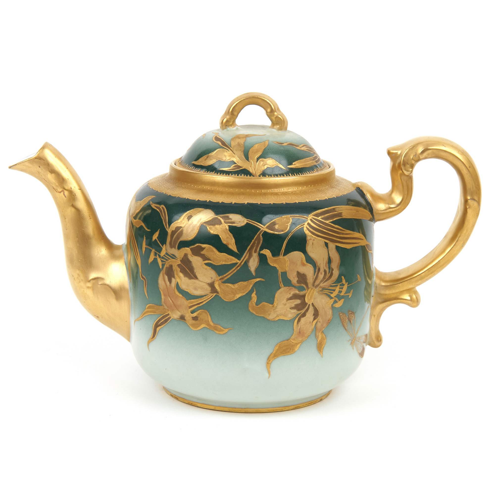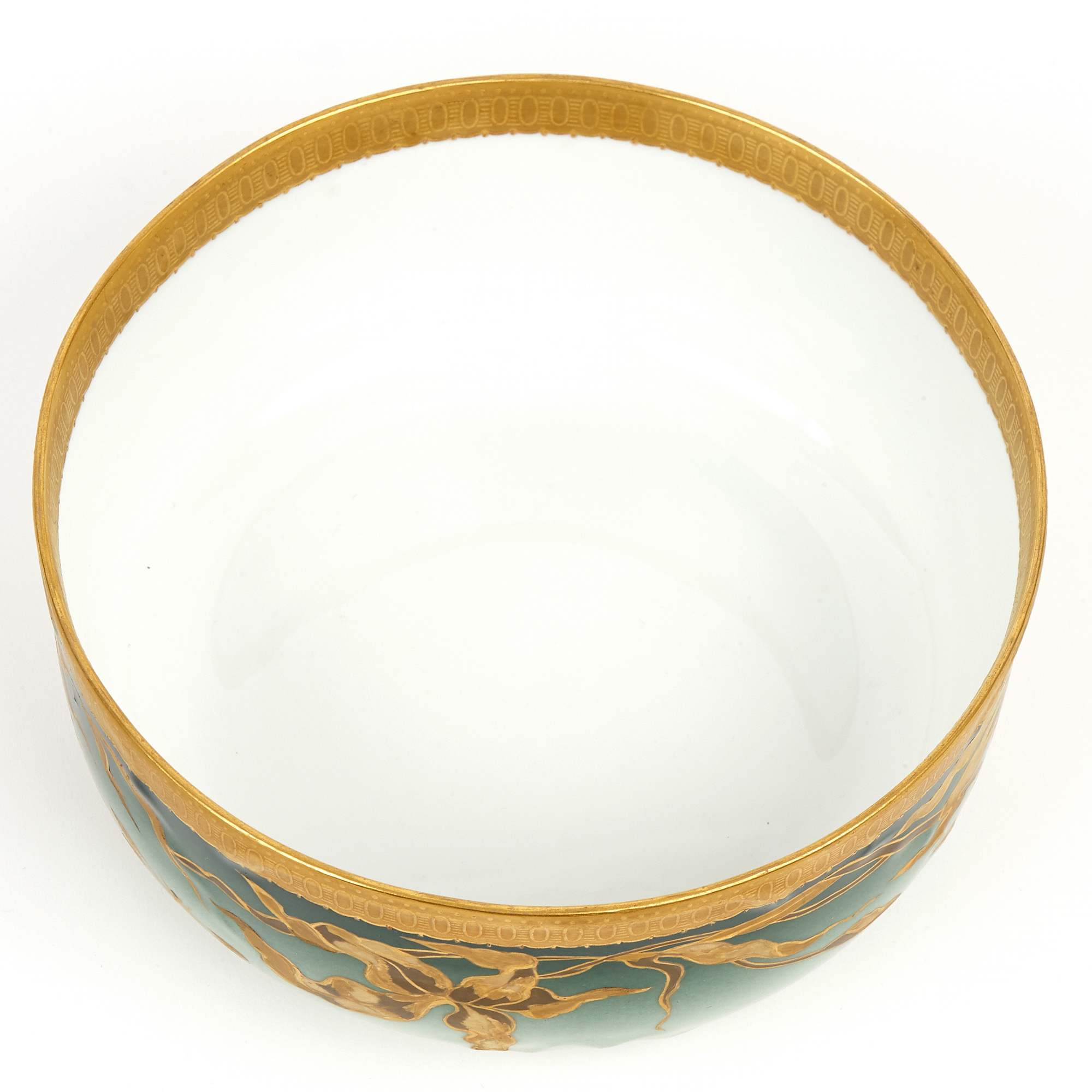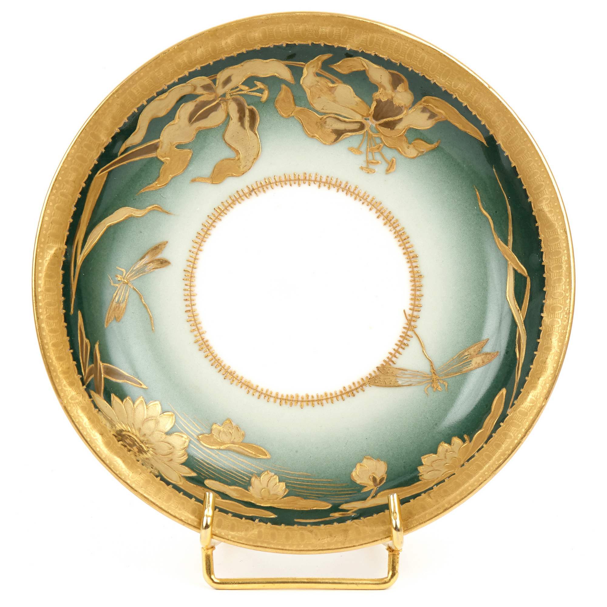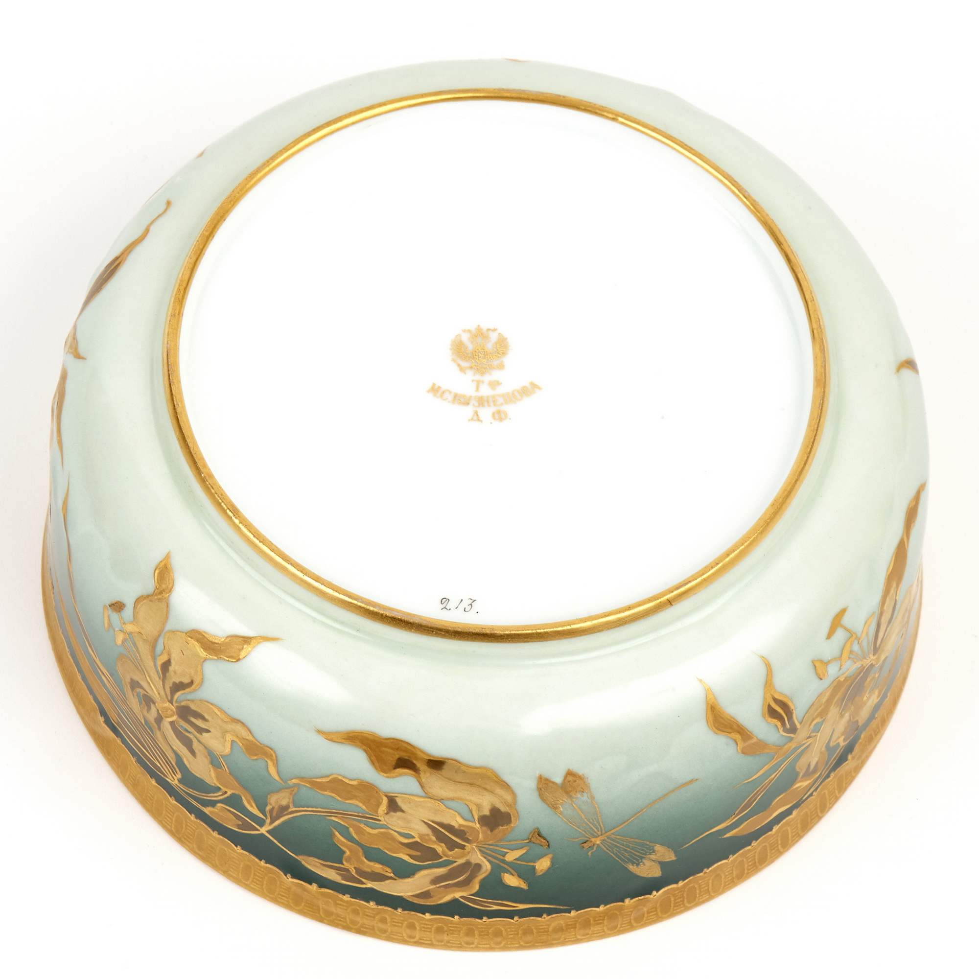 Красивый, яркий старинный сервиз изготовлен мастерами фабрики Кузнецова в стиле модерн. Превосходный белый тонкий фарфор покрыт изумительной росписью золотом разных оттенков. Относится к разряду штучных, заказных изделий, об этом, в том числе, говорит марка фабрики исполненная золотом.