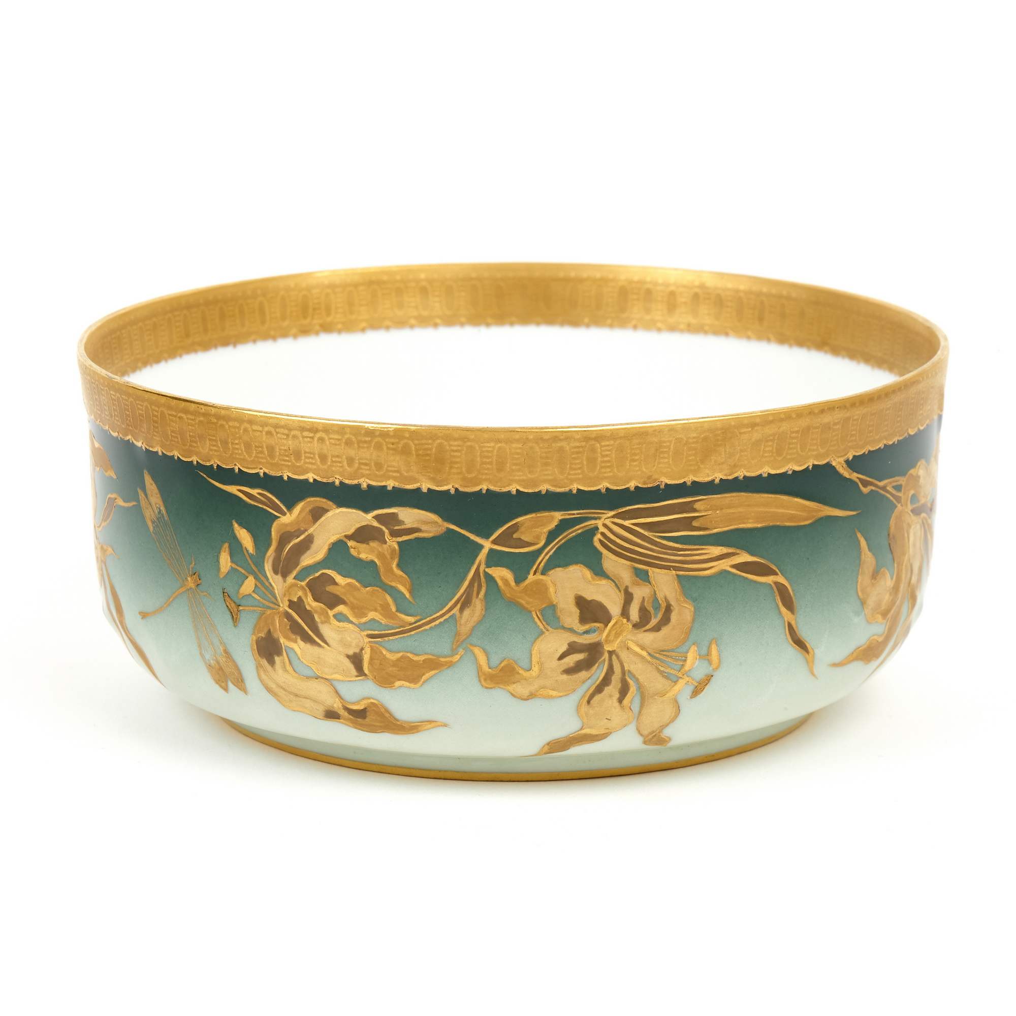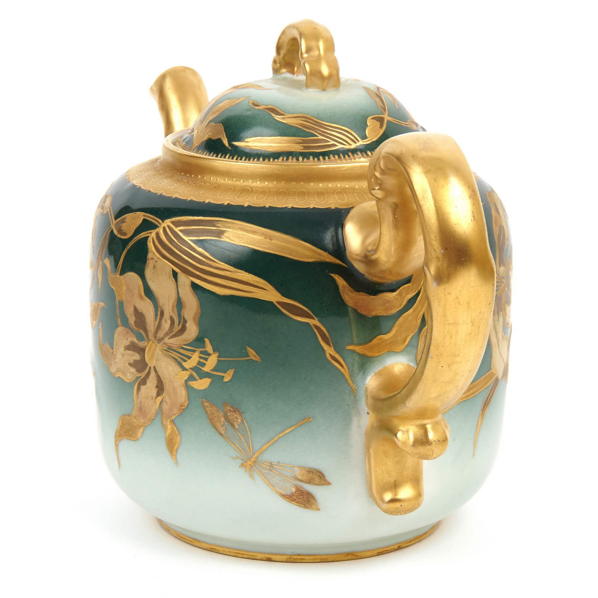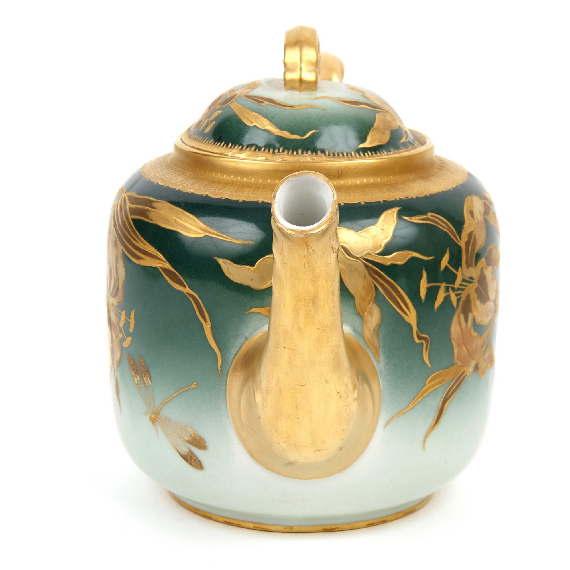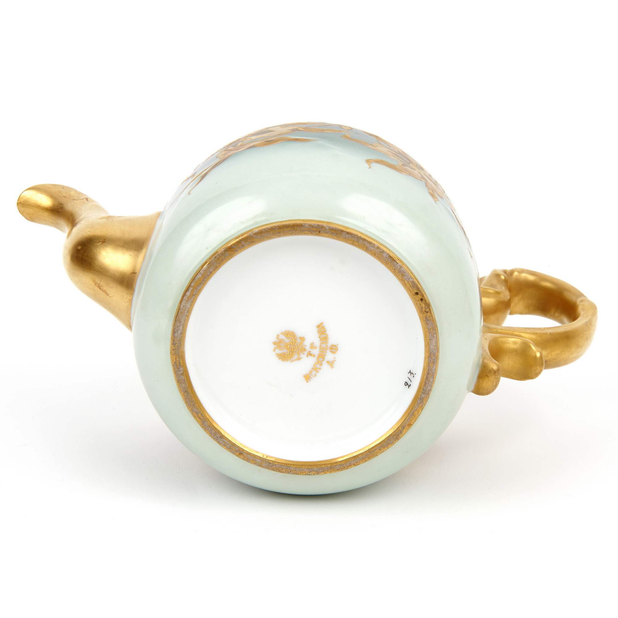 Красивый, яркий старинный сервиз изготовлен мастерами фабрики Кузнецова в стиле модерн. Превосходный белый тонкий фарфор покрыт изумительной росписью золотом разных оттенков. Относится к разряду штучных, заказных изделий, об этом, в том числе, говорит марка фабрики исполненная золотом.