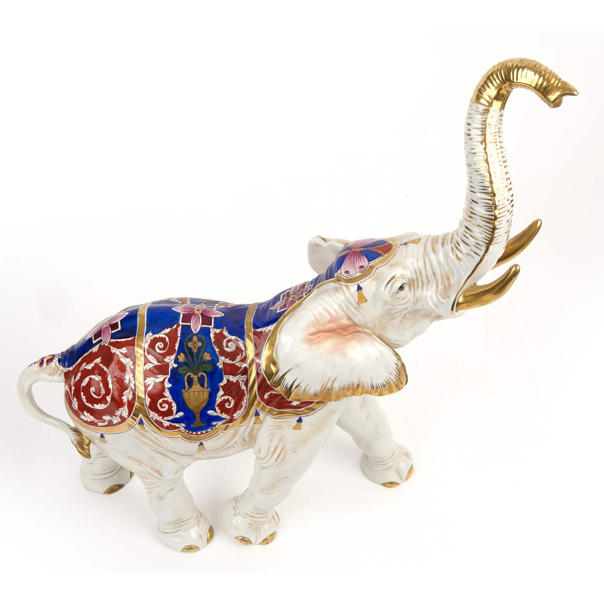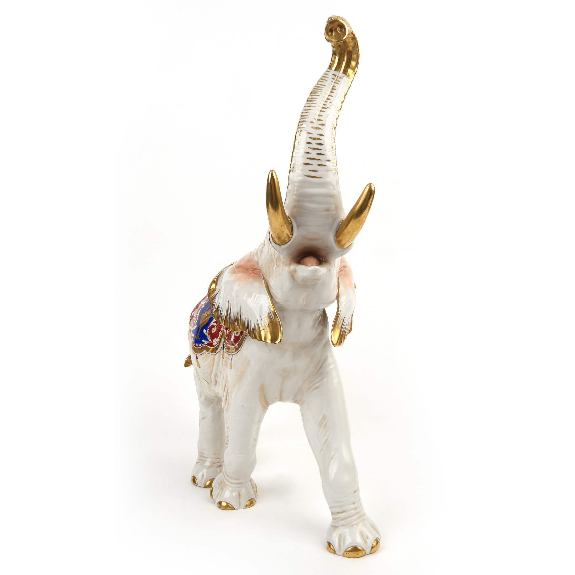 Красивая большая скульптура изображающая идущего слона накрытого богатым «восточным» покрывалом. Возможно, что изображен цирковой слон во время представления. Продукция старейшей фарфоровой фолькштедской мануфактуры Aelteste Volkstedter Porzellanmanufaktur. Хорошая сохранность.