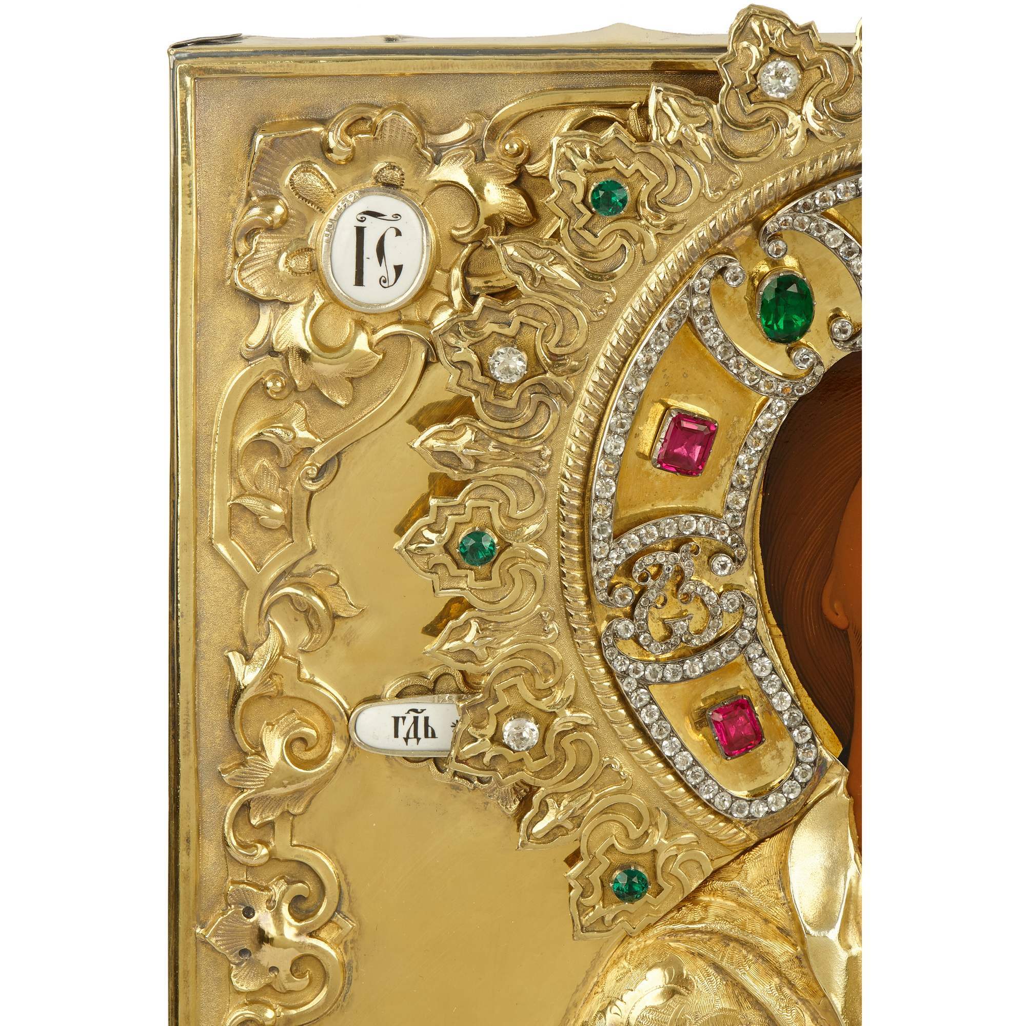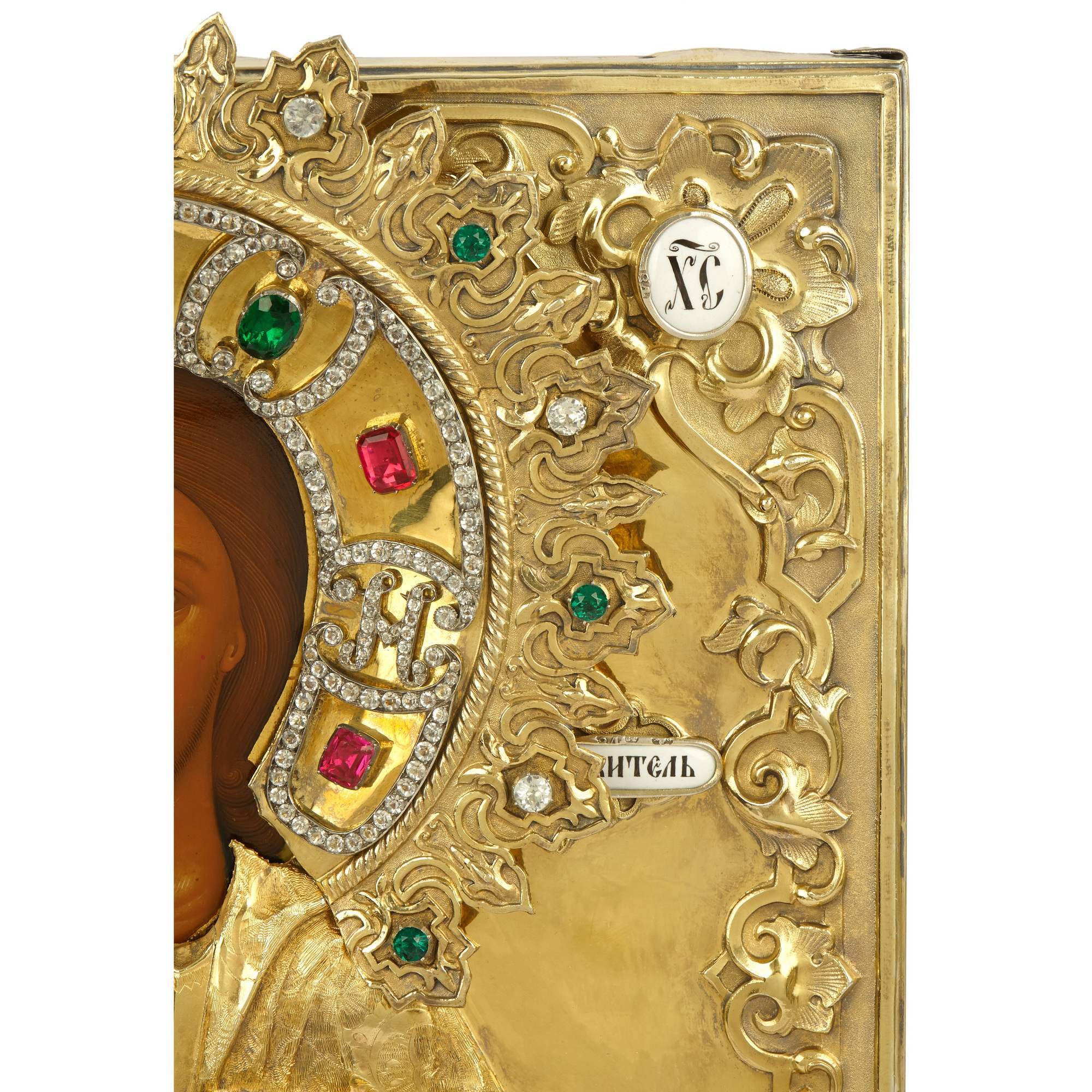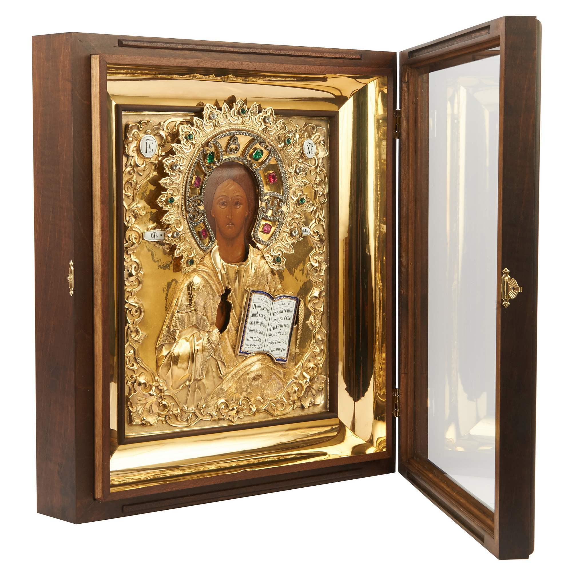 Прекрасная старинная икона с поясным изображением Господа Вседержителя в традиционной иконографии: с раскрытым Евангелием, на котором начертан текст от Матфея «Приидите ко Мне все труждающиеся и обремененные…», и благословляющим жестом десницы. Великолепное письмо, тонкие линии, нежные белые блики. Схожие образы встречаются среди наследия Строгановской иконописной школы и Мстерской художественной традиции. Икона украшена великолепным массивным серебряным золоченым окладом, выполненным с применением ювелирных техник и материалов, в том числе невероятно красивой выемчатой эмалью, имитирующей изогнувшиеся страницы, филигранно выполненной гравировкой и инкрустацией. Венец спасителя украшен вставками из горного хрусталя. Представленная икона безусловно является частью великого наследия русской иконописной школы, знаменитого на весь мир не только прекрасным качеством исполнения, но и внутренней духовной наполненностью.