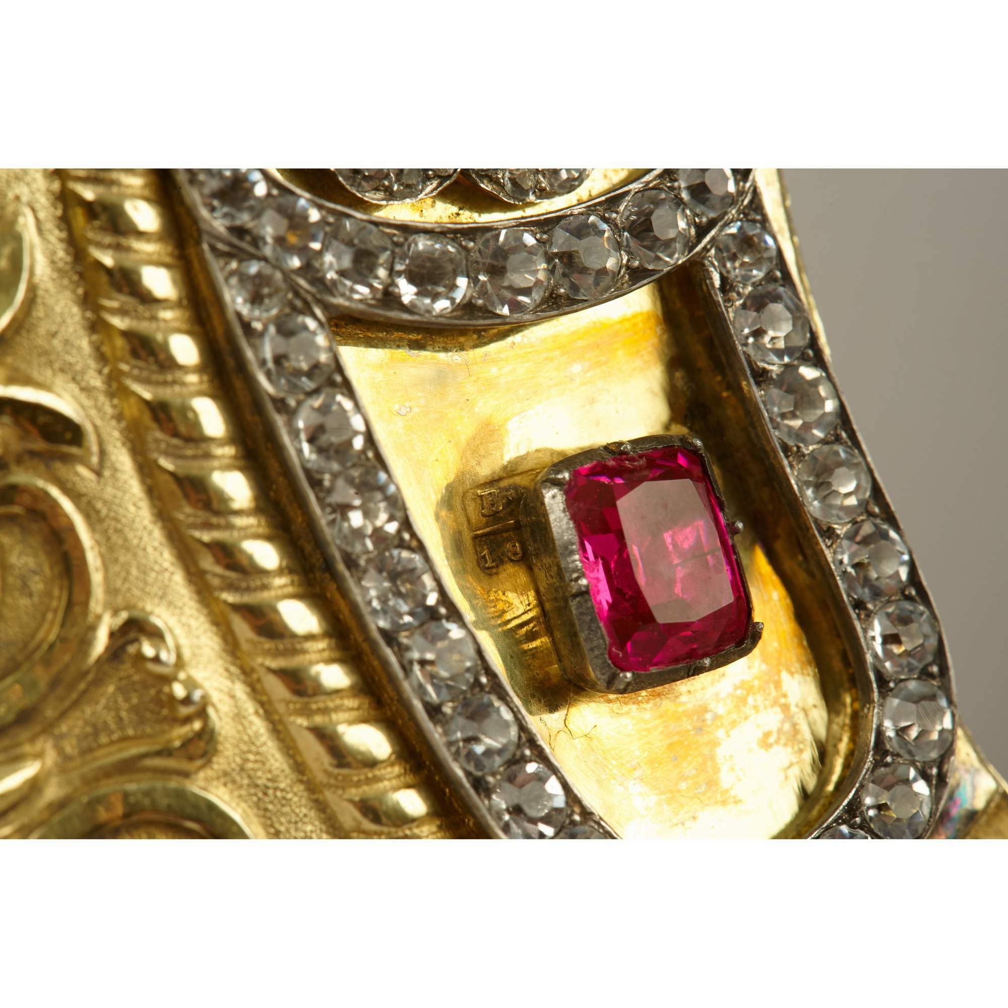 Серебро 84, эмаль, горный хрусталь, старинное стекло. Литье, зернь, скань, штамповка, чеканка, гравировка, циновка, эмаль по скани, выемчатая эмаль, монтировка.