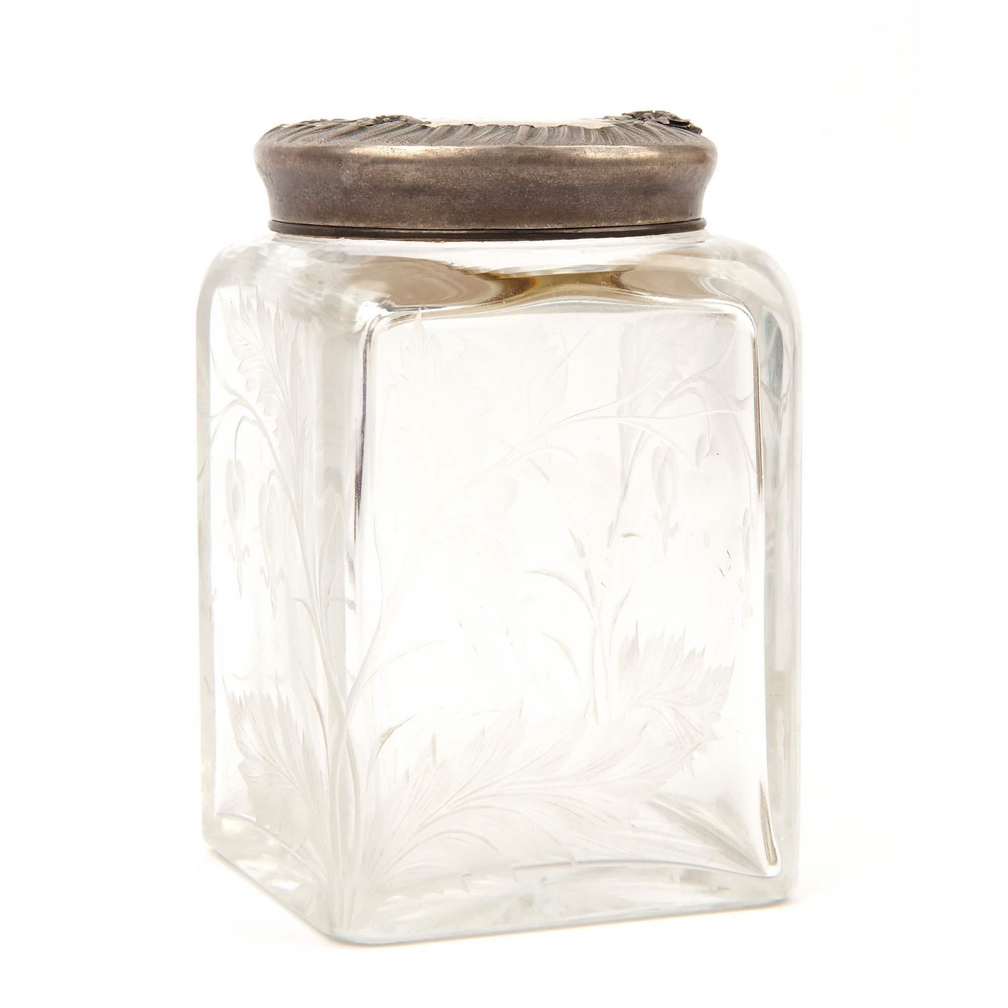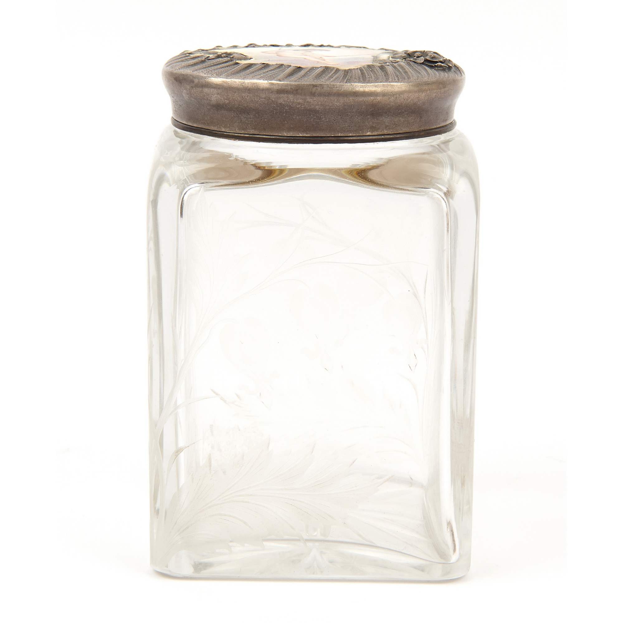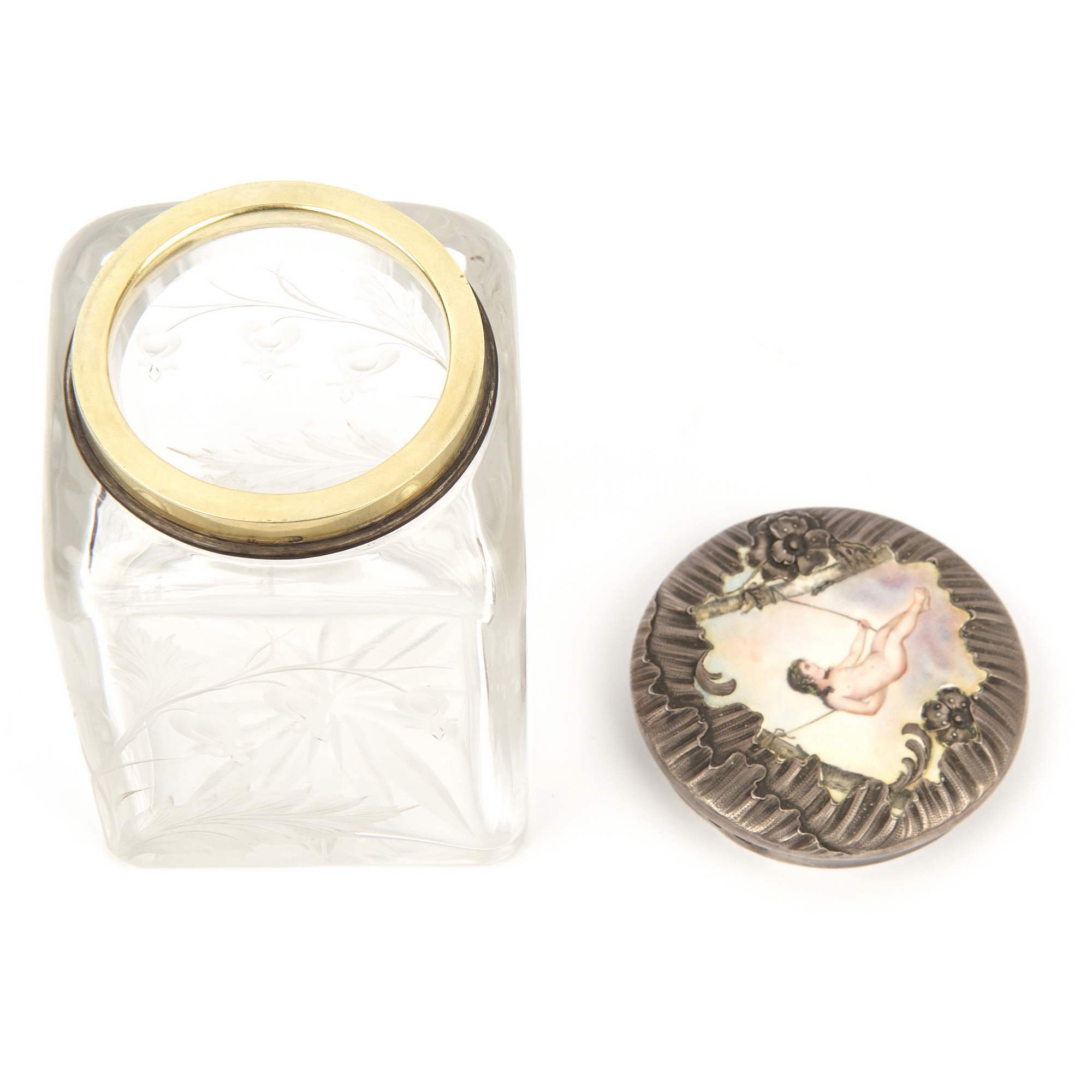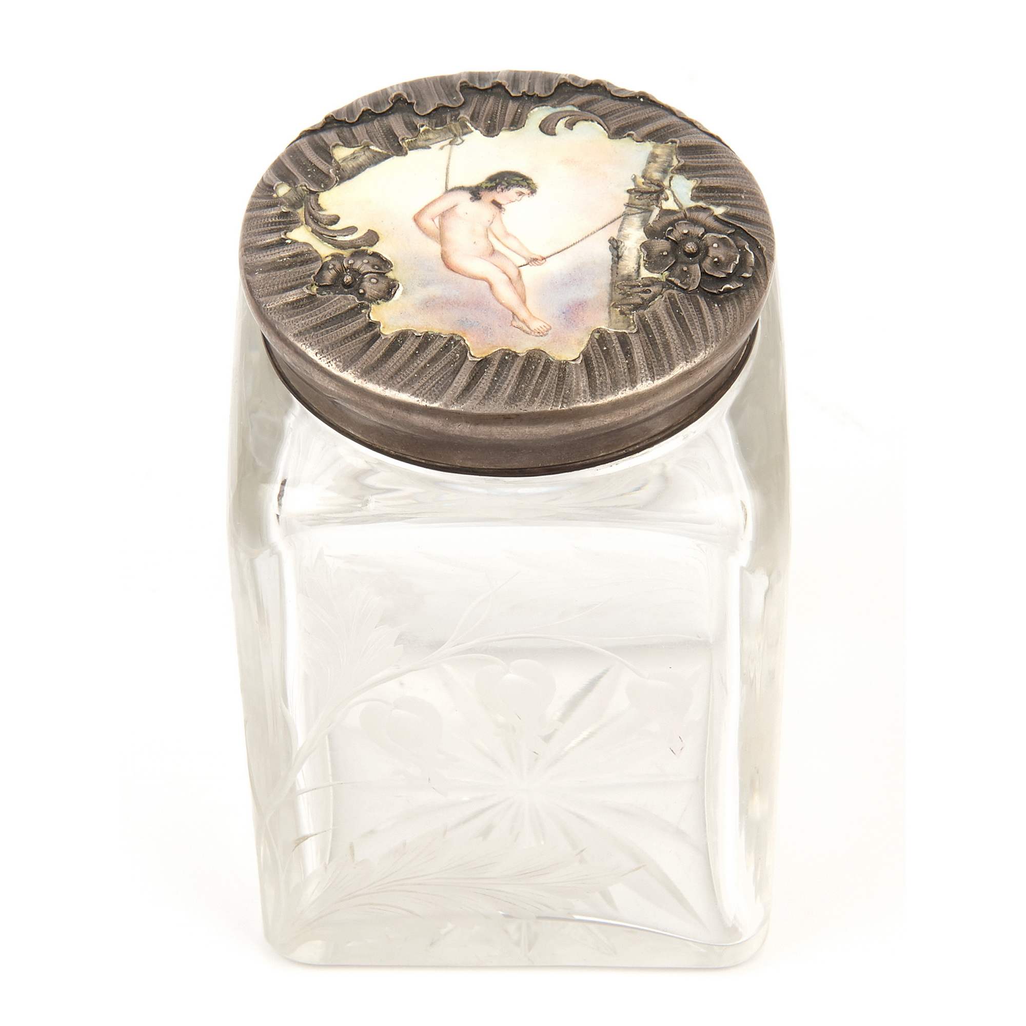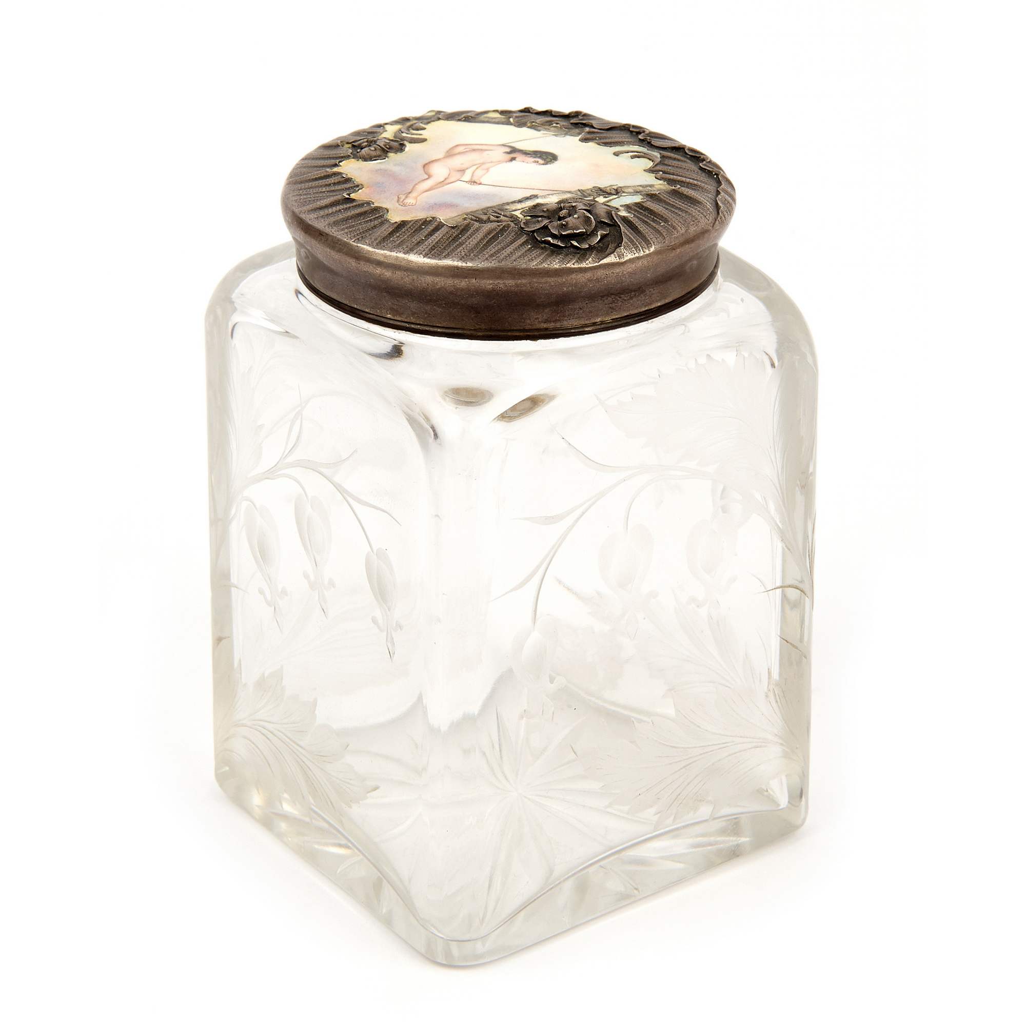 Очень красивый старинный предмет, баночка «Купидон качается на качелях на фоне неба». Изумительной красоты массивная стеклянная основа, со стилизованным цветочным рисунком «Дицентра - Разбитое сердце» ( явно работа мастеров ИСЗ ), украшена прекрасной оправой из драгоценного серебра с эмалевой миниатюрой.