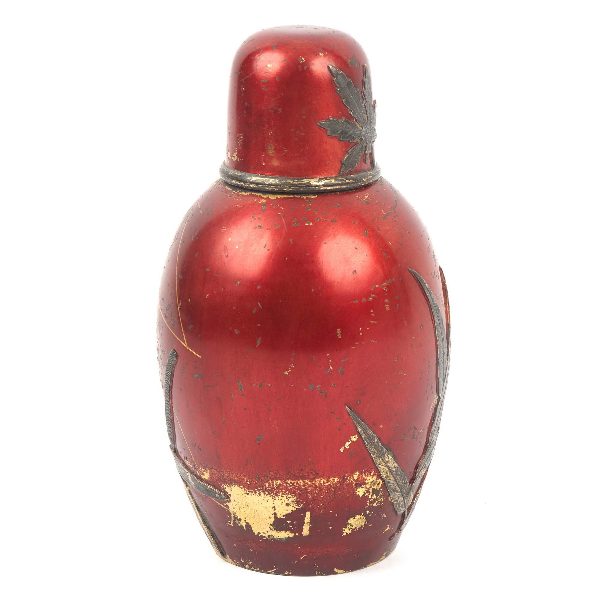 Изумительная чайница работы знаменитой фирмы П. Овчинникова с подлинными клеймами. Великолепный декор изделия ориентирован на китайско-японское искусство. На поверхности, покрытой ярко-красным эмалевым лаком, размещены чеканные изображения водных растений, стрекозы, попавшей сети паука, который размещен ближе к плечикам сосуда в центре золотой паутины. Крышка также украшена эмалевым лаком, чеканным листом японского клена и мушкой. Поражает как сложность задумки, так и отличное мастерство ее исполнения. Линии паутины образованы благодаря фрагментарному заполнению фона эмалевым лаком. Чеканные образы проработаны до мельчайших деталей, их цвет выразительно контрастирует с яркой поверхностью. Изготовлена эта замечательная чайница на знаменитой фабрике Павла Акимовича Овчинникова, чья продукция славилась очень высоким качеством. Произведения фирмы участвовали на всероссийских и всемирных выставках, отмечались высшими наградами, утверждая первенство русских ювелиров. Являясь исполнителями крупных государственных заказов для императорского двора, мастера фирмы во многом стали законодателями моды, зачастую не только продолжая сложившиеся традиции, но и формируя новые тенденции серебряного и золотого дела второй половины XIX – начала XX века. Одним из востребованных и популярных веяний в конце XIX века стало увлечение искусством Японии в частности и Дальнего Востока в целом. Предметы, выполненные фирмой П. Овчинникова в схожей с представленной чайницей манере можно увидеть в собраниях Государственного Исторического музея, Музеев Московского Кремля, в крупных частных собраниях. Однако у данной чайницы есть уникальная черта - дарственная надпись «От А и О Овчинниковых». У Павла Акимовича было четыре сына. Один из них - Александр Павлович - заведовал московским отделением фирмы и магазином в Москве. Тот факт, что на подлинном клейме есть московский герб, позволяет сделать вывод, что эта великолепная чайница была подарена некоему лицу одним из сыновей знаменитого ювелира - одним из наследных владельцев фирмы, продолживших дело Павла Акимовича Овчинникова, ничуть не преуменьшив его замечательное наследие. Инициал «О» вероятно принадлежал супруге Александра Павловича Овчинникова, подробной информации о ней на сегодняшний день установить не удалось.
