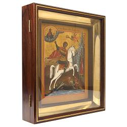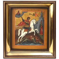 Красивая икона с изображением Чуда Георгия о змие. Лики написаны профессионально, в традиционной манере. Изящные, слегка вытянутые пропорции фигур, грамотная моделировка одеяний пробелами, миловидность ликов - все это говорит о немалом таланте иконописца, создавшего образ. Выразительная традиционная манера письма свидетельствует о принадлежности мастера к палехской школе. Палех - один из крупнейших центров иконописания в России. Его умельцы создавали качественные и выразительные произведения, вдохновленные искусством Древней Руси, бережно храня отечественное наследие. Иконы, исполненные палехскими иконописцами, продавались по всей стране и за ее рубежами, часто предназначаясь для состоятельных заказчиков.