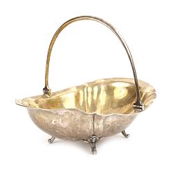 Красивая старинная сухарница, выполненная из «царского» серебра в последней четверти XIX века. Такой способ декорирования принято называть «дольчатым», из-за характерного разделения на своеобразные дольки. Подобное решение может вызвать разные ассоциации, например, плоды цитрусовых деревьев, что также подкрепляется красивой, глубокой позолотой. Но все же, наиболее точным сравнением является именно морская раковина. Перламутровый блеск серебряной поверхности и причудливые изгибы сухарницы напоминают удивительное чудо природы – дом моллюска, раковину. Использование морской тематики, раковин и наутилусов характерно для стиля Барокко, а в данном случае для историзма, заимствующего барочную эстетику. Предмет обладает коллекционным и музейным значением. Хорошая сохранность. Антиквариат.