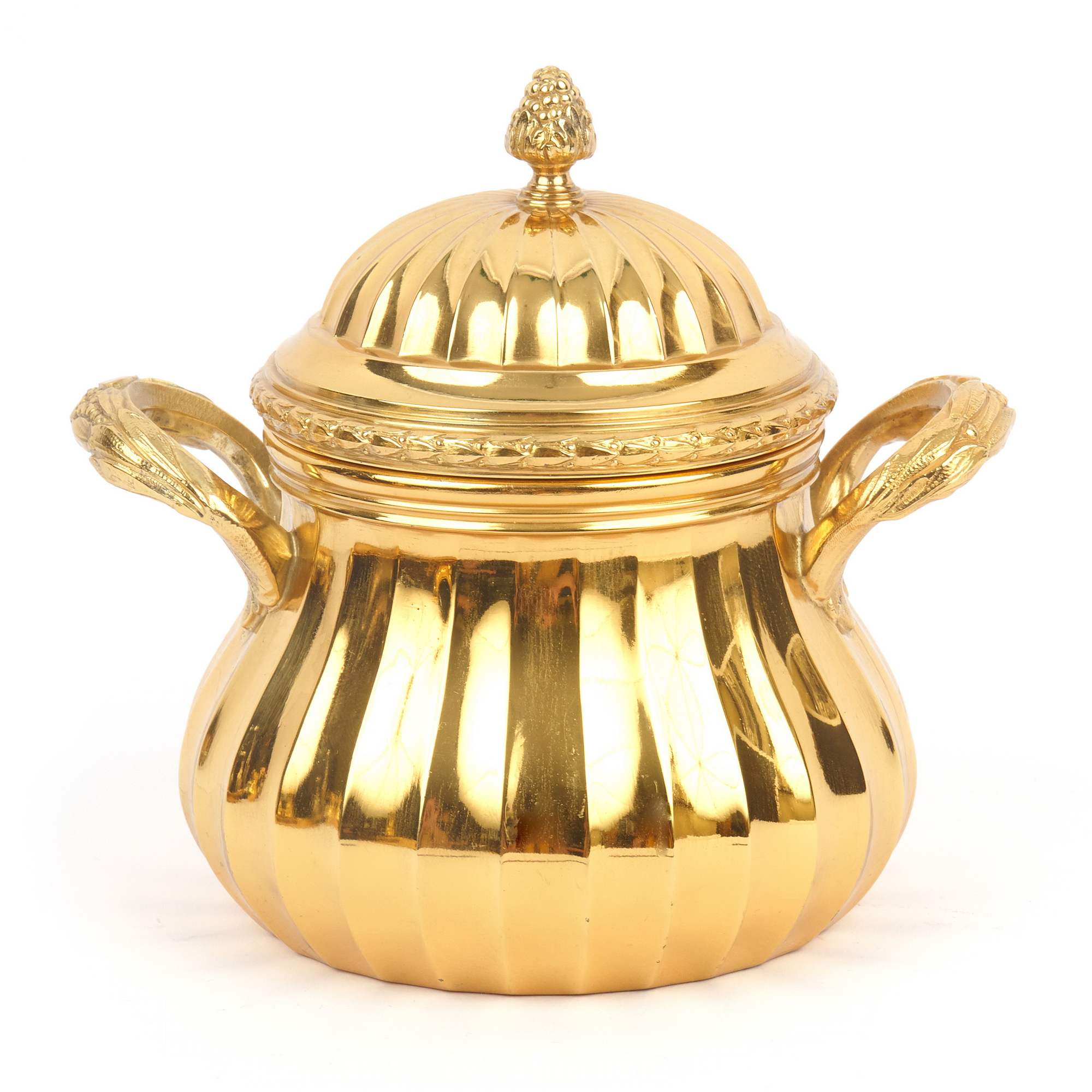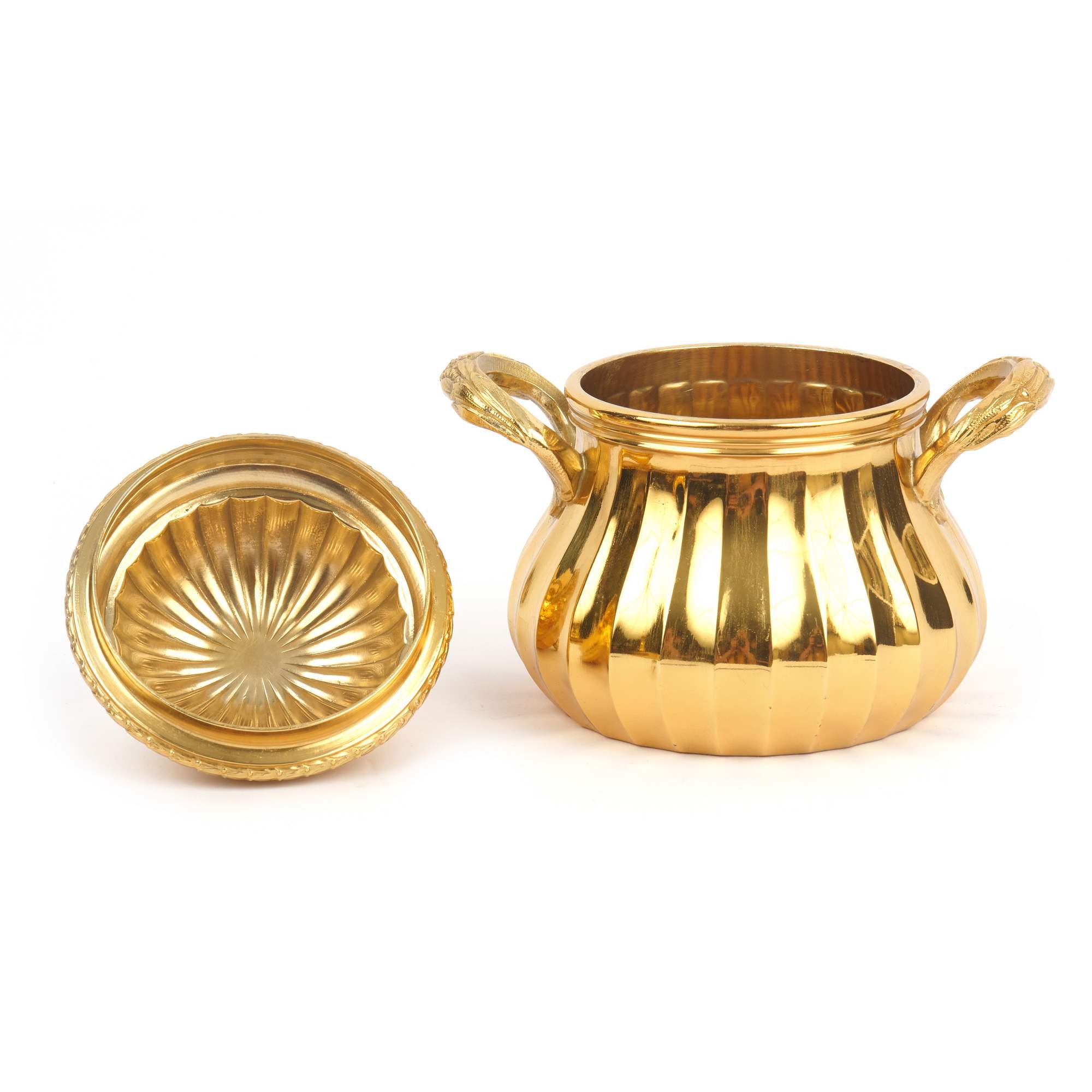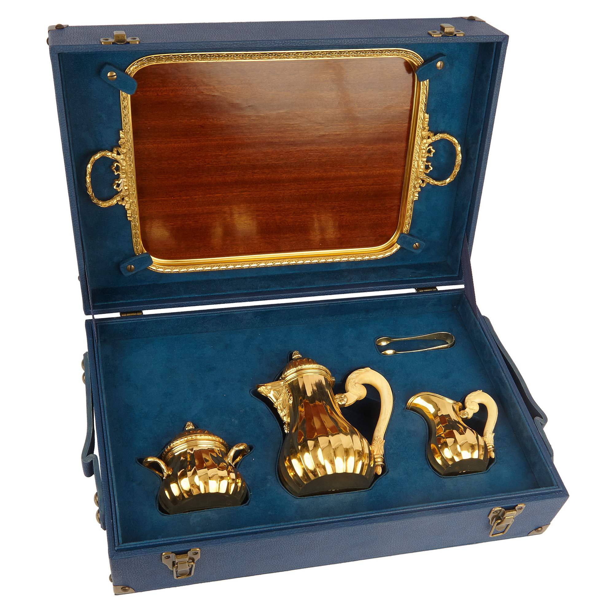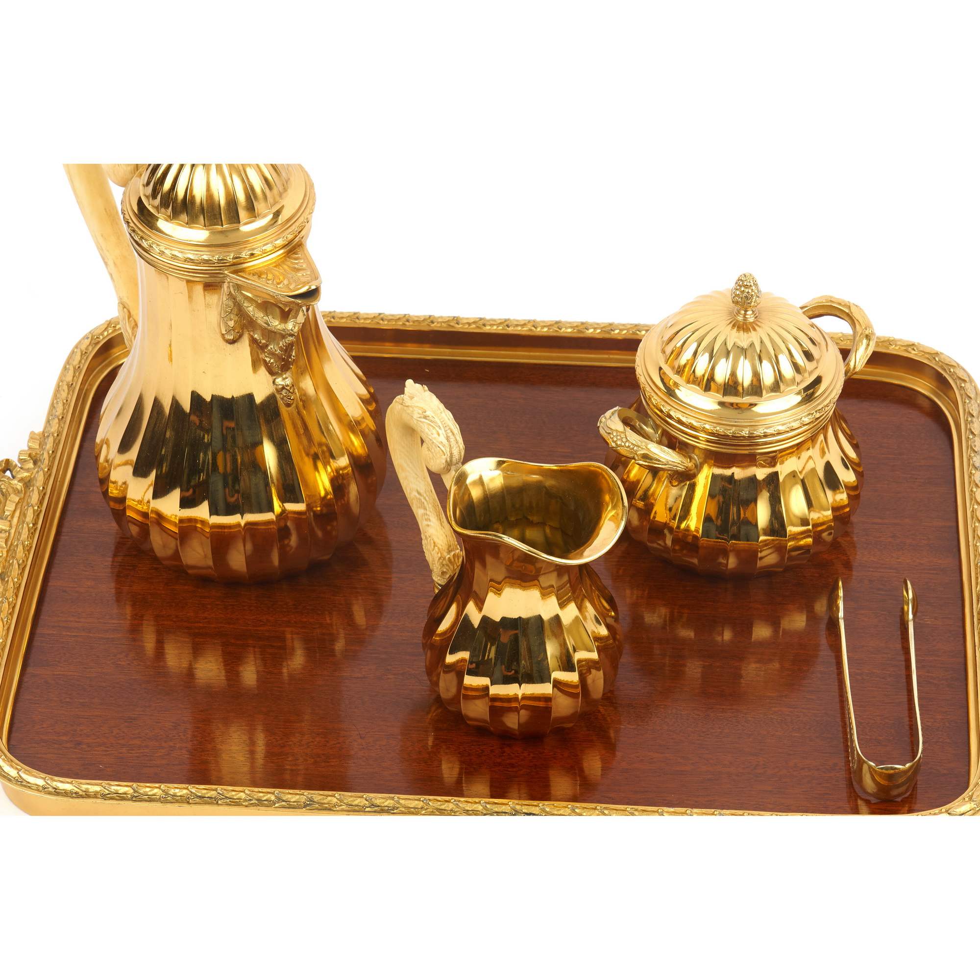 Замечательный, изящный старинный чайно - кофейный сервиз из пяти предметов. Очень интересная компоновка из золоченого серебра, дерева и слоновой кости. Яркий и качественный образец работы немецких мастеров серебряного дела. Антиквариат. Отличная сохранность. Германия. Первая четверть ХХ века. Коробка современная, изготовлена нашей мастерской из специальных материалов, для удобного пользования и дарения.
