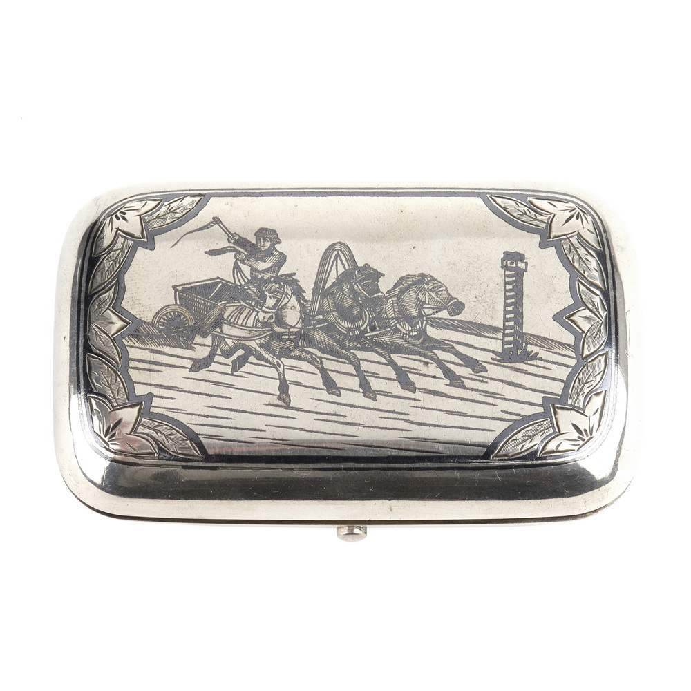Красивый, старинный портсигар "Русская тройка". Яркий образец работы русских мастеров серебряного дела работавших с чернью. Царская Россия. Москва. 1894 год. Антиквариат. Отличная сохранность.