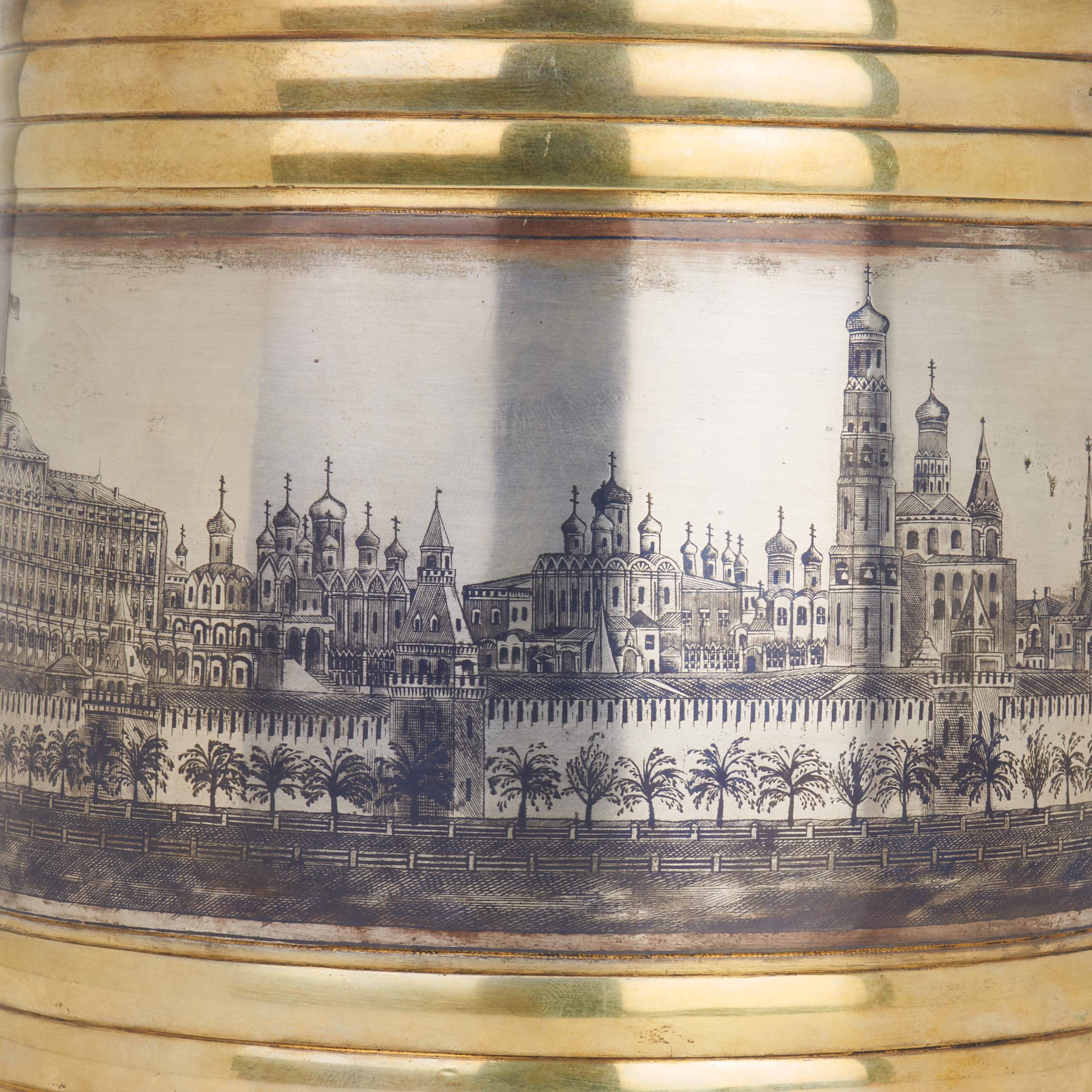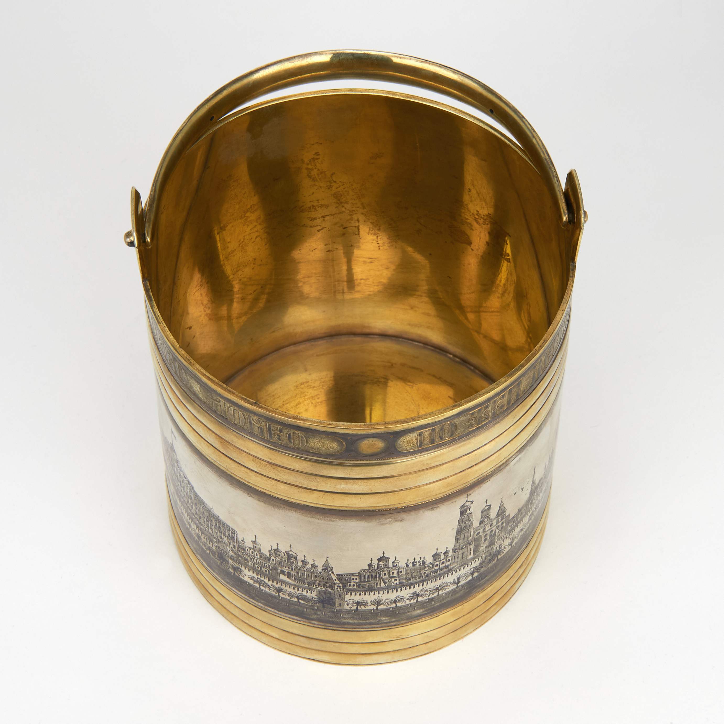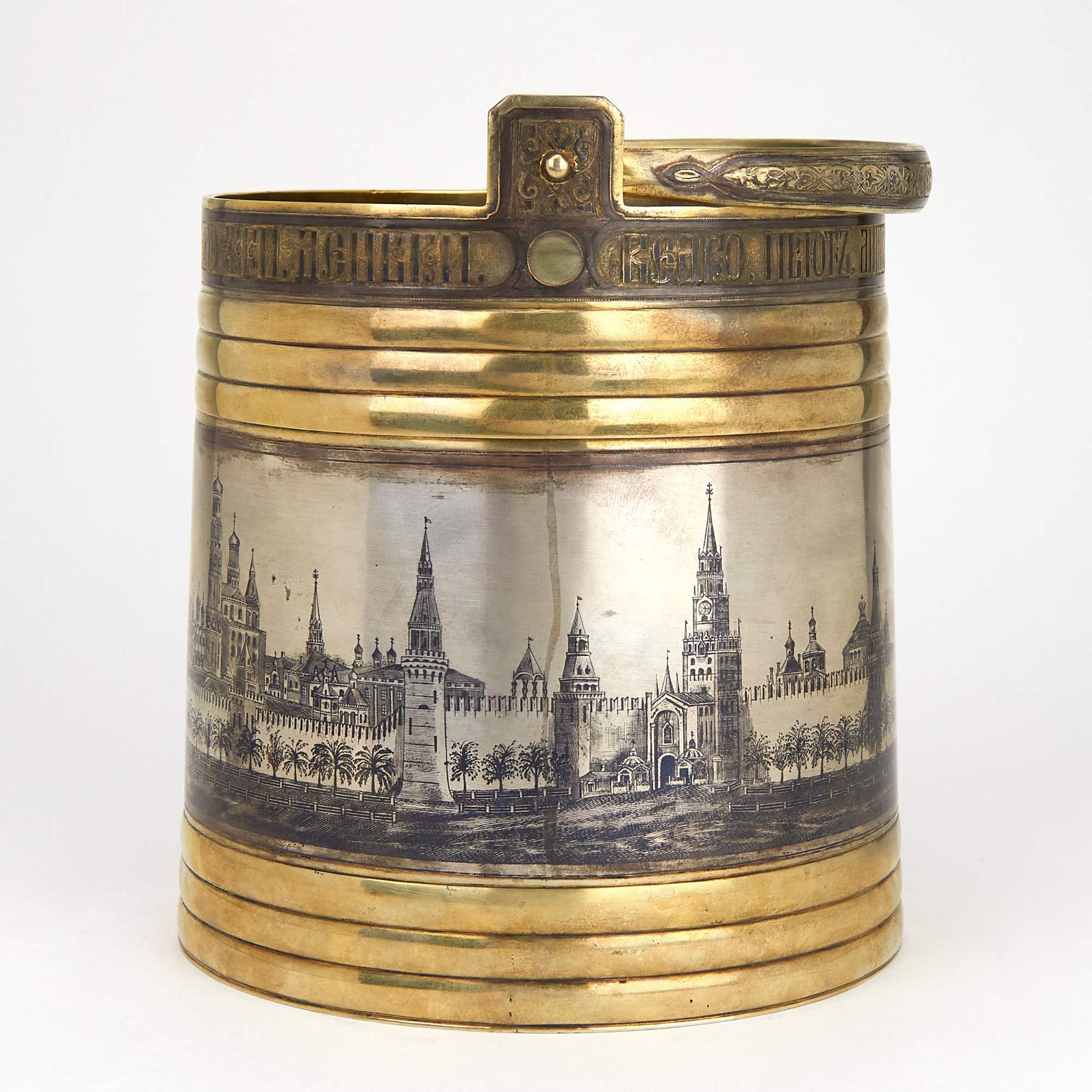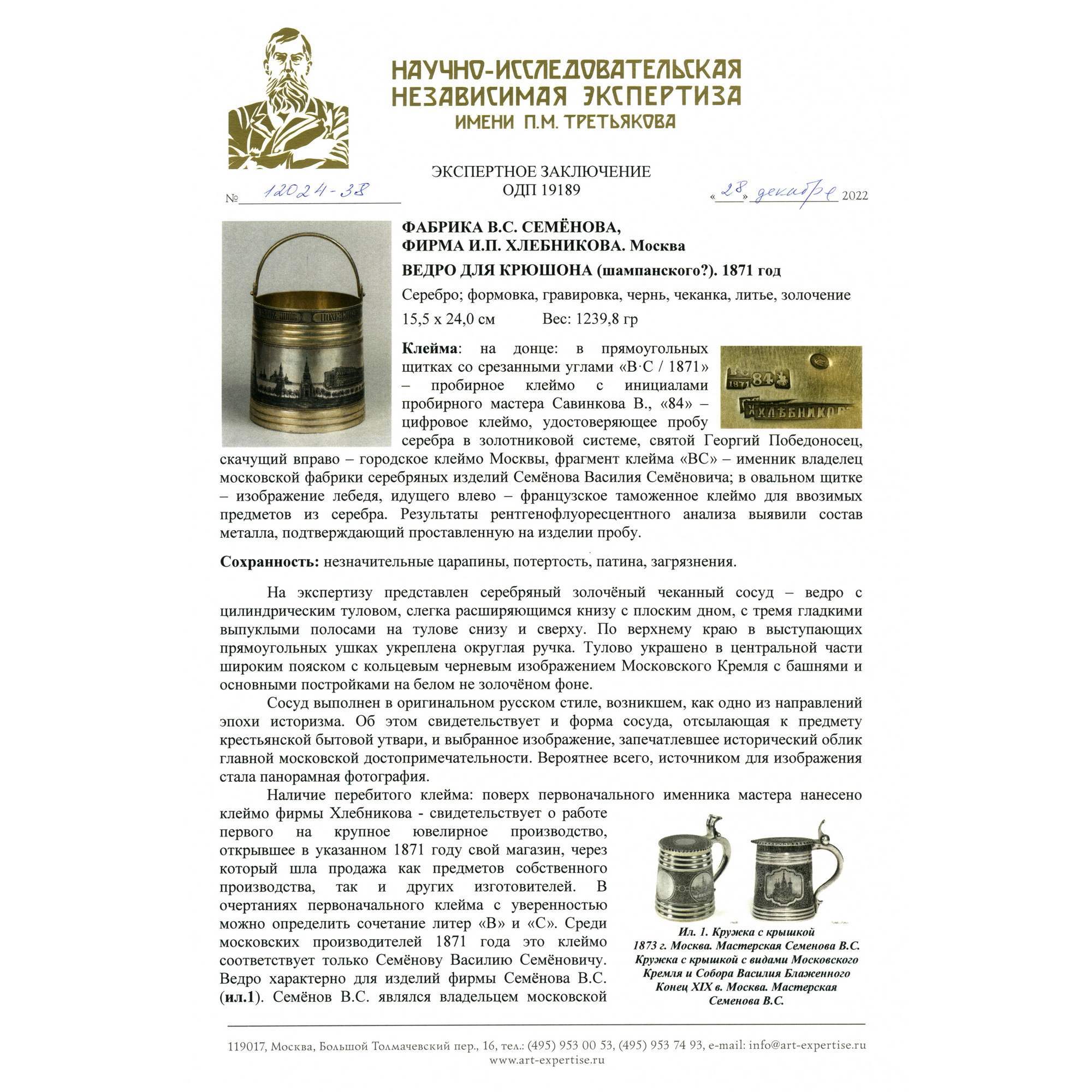 Изумительной красоты, старинное большое ведро для крюшона ( сбитня ) с видами на Московский Кремль изготовлено фабрикой Василия Семенова в 1871-м году по заказу фирмы Хлебникова. По верху ведерка идут надписи в старо-славянском стиле «ПИВО, ДОБРО, ПО ТРИ ДЕНЬГИ. ВЕДРО ПЬЮТ, ЛИШЬ ПОХВАЛИВАЮТЬ». На тулове чернью нанесено панорамное изображение Московского Кремля.