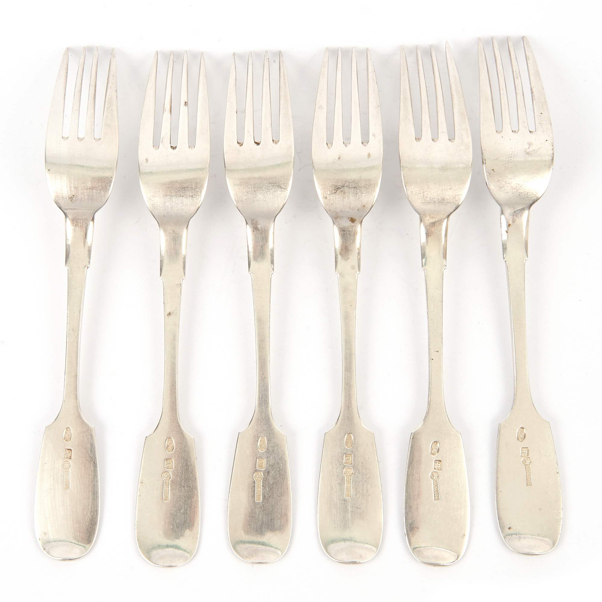 Красивые большие старинные серебряные вилки, изготовленные на рубеже веков для Торгового дома Морозовых, основанного Иваном Екимовичем Морозовым, купцом 1-й гильдии и мастером-ювелиром, почетным гражданином Российской Империи. С 1884 года его Торговый дом имел высокое и почетное звание Поставщиков Двора Его Императорского Величества. Высокое качество изделий вывело Торговый дом Морозовых и их ювелирную мастерскую на лидирующие позиции не только в России, но и за рубежом. Фирма Морозовых тесно сотрудничала со многими известными ювелирами Российской империи, например, с Фаберже. В настоящий момент изделия Торгового дома Морозовых украшают крупнейшие музейные собрания России, такие как ГИМ. Хорошая сохранность. Антиквариат.